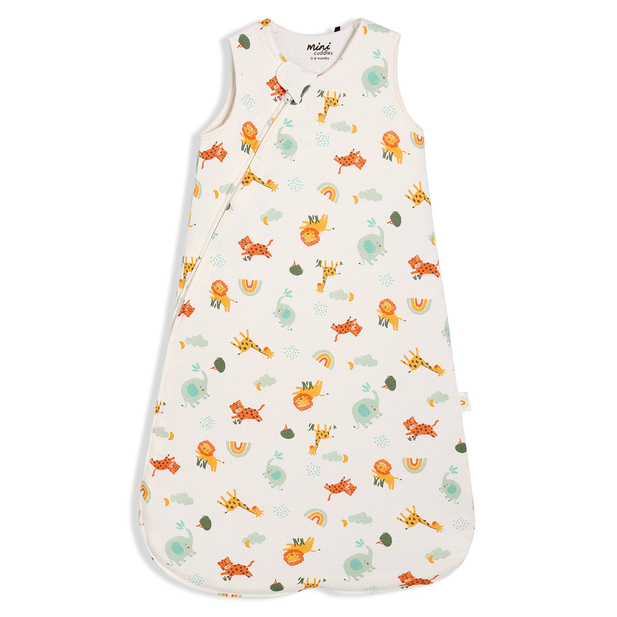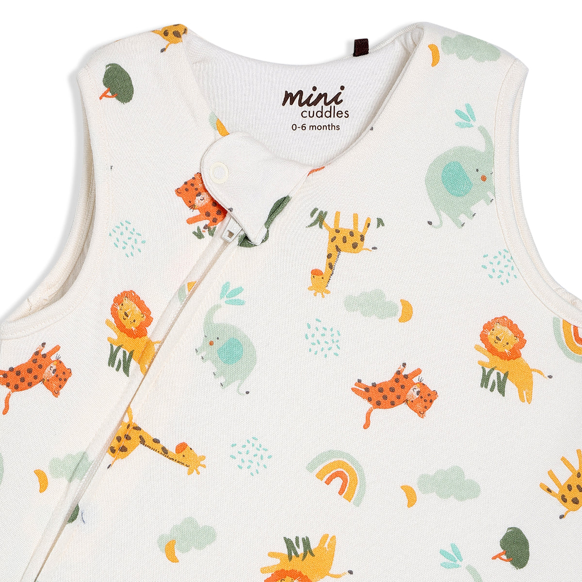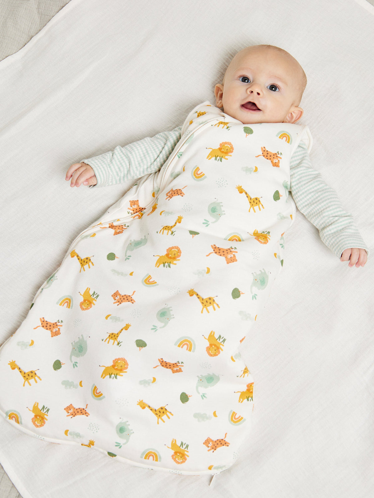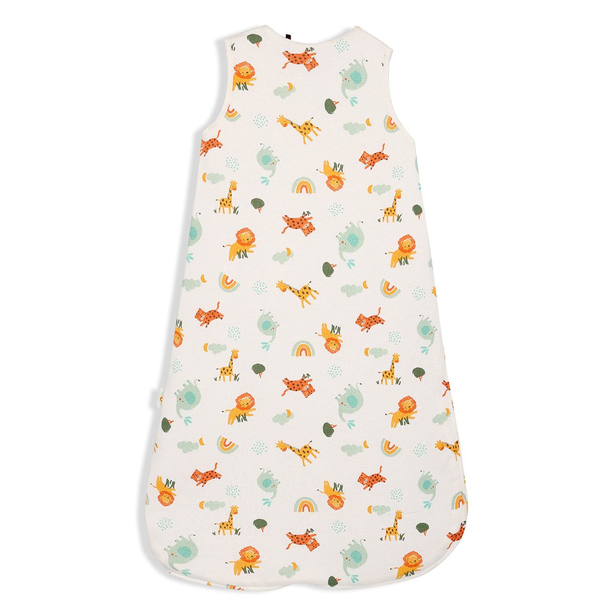 The cheerful all-over print features lions, giraffes, elephants, rainbows, and clouds — a joyful safari scene to brighten bedtime. Fully lined in jersey with a soft hand feel, it comes with a concealed two-way zip and popper fastening at the shoulder for quick, fuss-free changes, plus a zip guard for extra comfort.