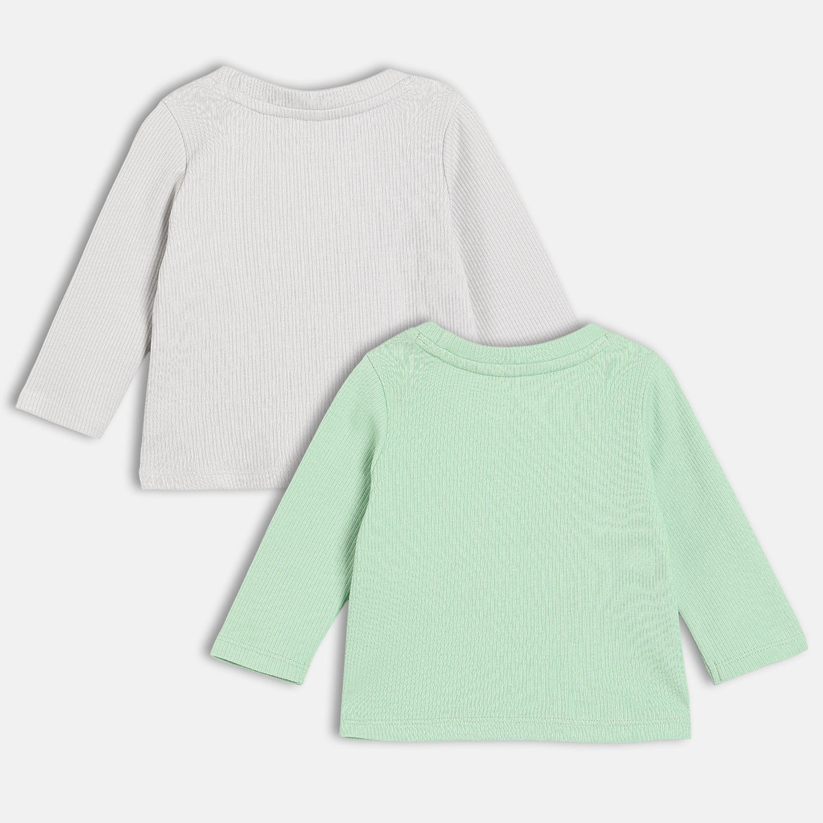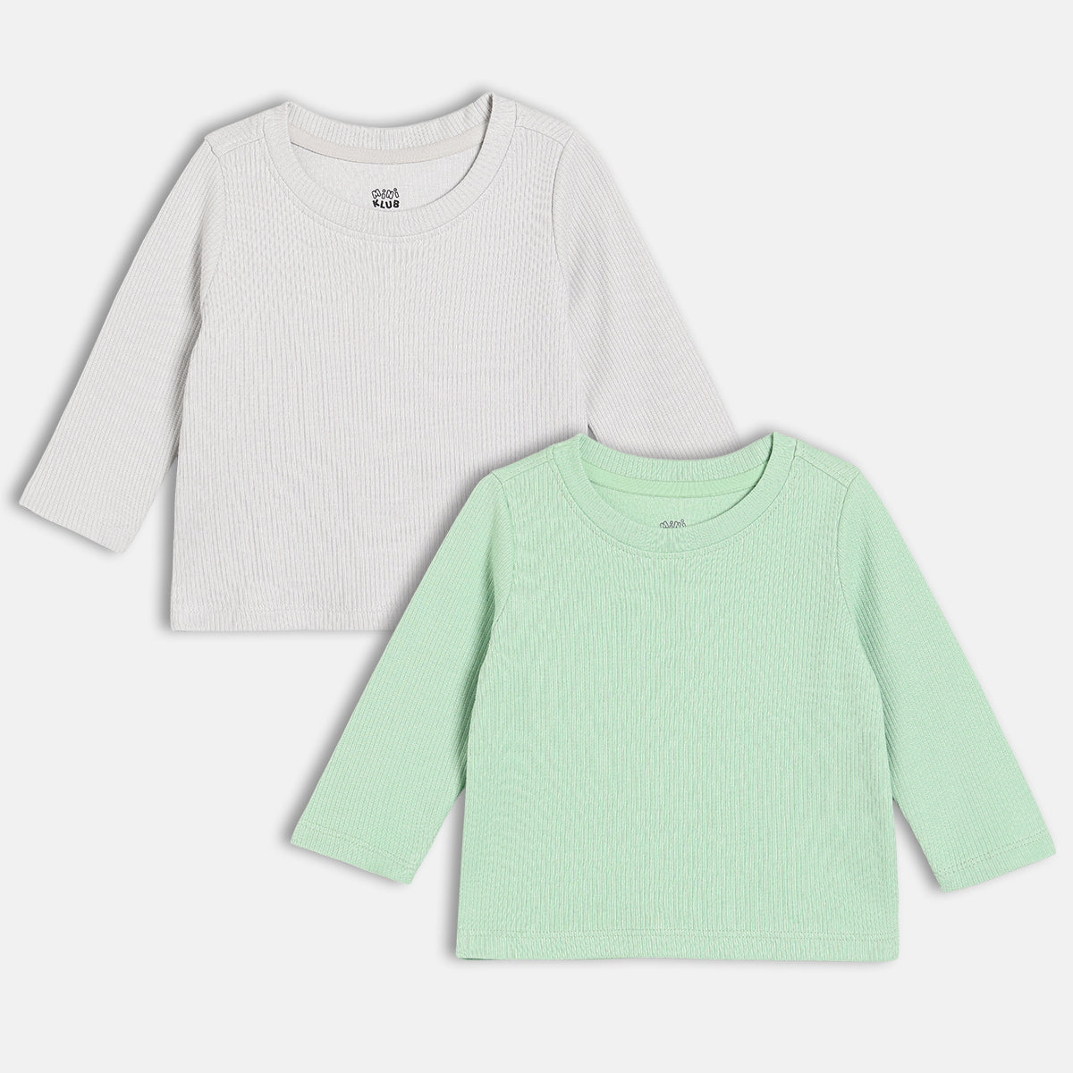 Refresh your baby’s wardrobe with this pack of 2 ribbed full-sleeve tops, crafted for all-day comfort and style. The set features one top in soothing mint green and another in classic white, perfect for everyday mix-and-match outfits. Made from soft, breathable ribbed cotton fabric, these tops offer a snug yet flexible fit. The round neckline ensures easy dressing, making them a must-have essential for your little one’s wardrobe.