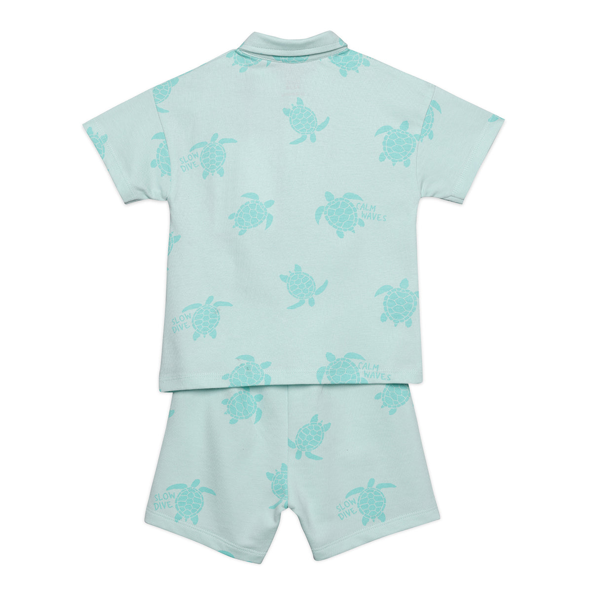 This cute coordinated set includes a soft mint green polo T-shirt and matching shorts, both featuring an all-over turtle print with playful text. Made from comfortable, breathable fabric, the set is perfect for warm days, outings, and everyday casual wear.