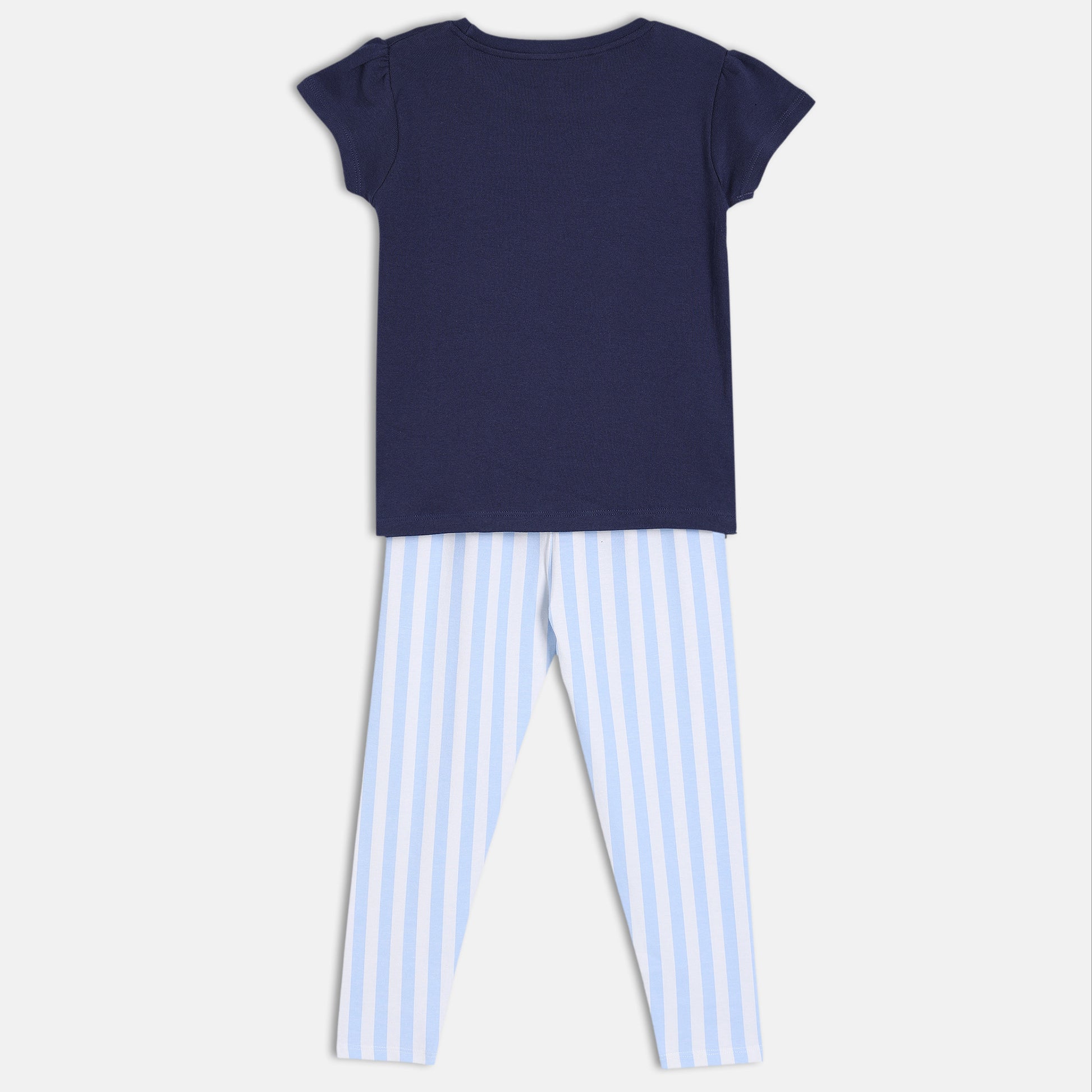 Baby Girls Printed Top and Striped Leggings Set , Navy Blue and Light Blue