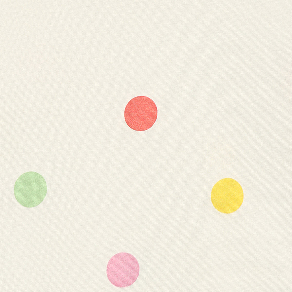 Add a pop of fun to your little girl’s wardrobe with this adorable off-white top featuring bright multicolored polka dots. Crafted from soft, breathable cotton fabric, this top ensures comfort all day long while keeping your child stylish. The ruffle detailing on the shoulders adds a cute, girly touch, and the back button closure makes dressing easy and convenient. Perfect for pairing with leggings, skirts, or jeans, this top is ideal for casual outings, playdates, or everyday wear.