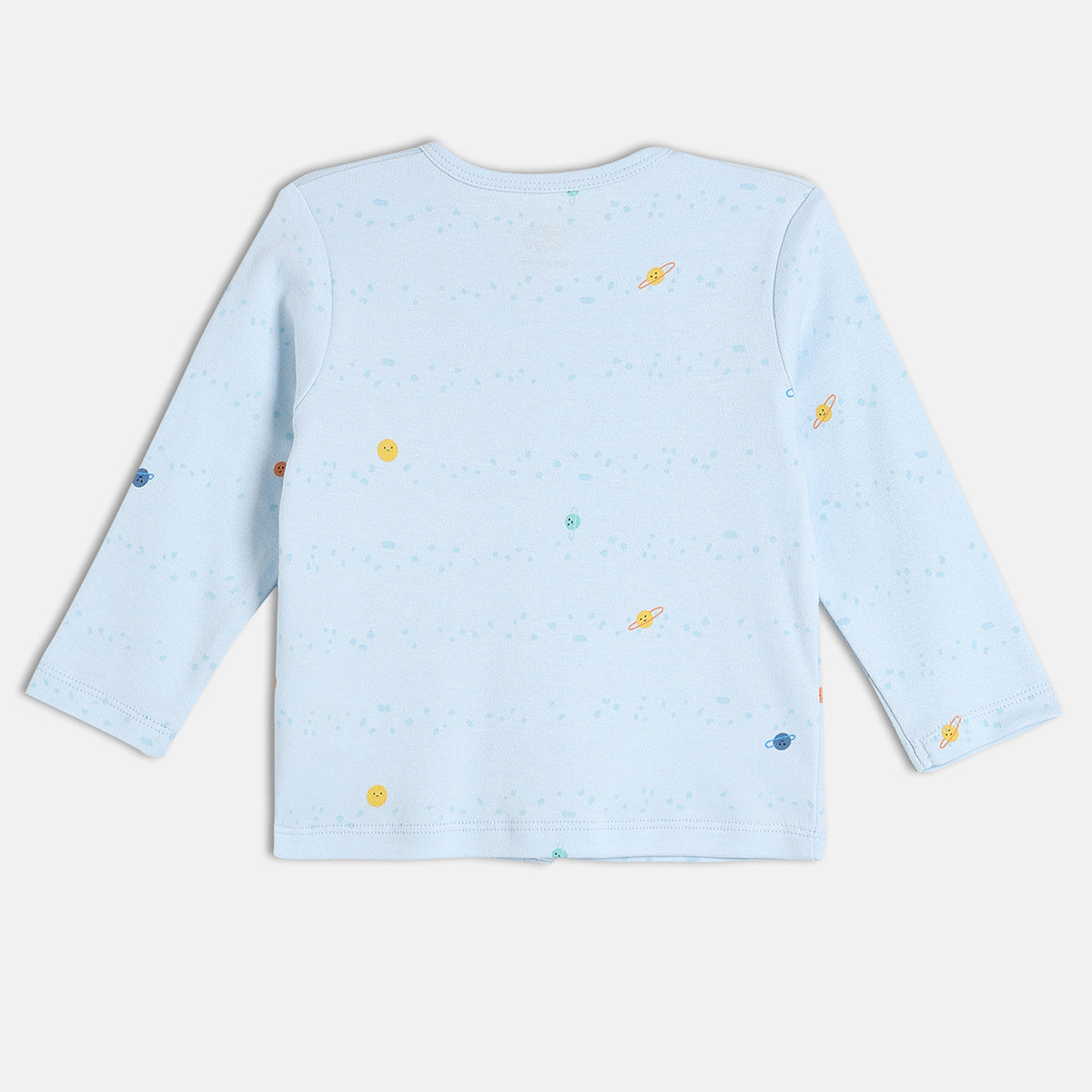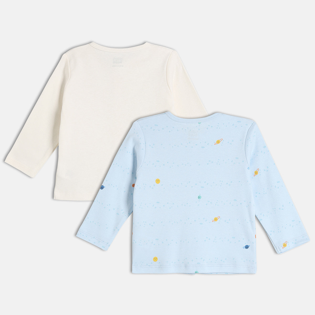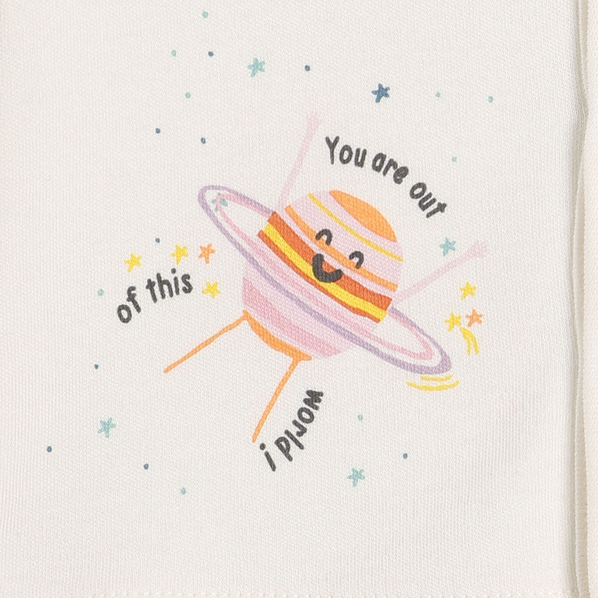 This adorable pack of two front-open knit vests combines comfort with a fun, space-themed design. Made from soft, breathable cotton knit fabric, one vest features an all-over planet print on a soothing blue base, while the other comes in a cream color with a cute UFO graphic. Perfect for layering, these vests keep your little one cozy and stylish.
