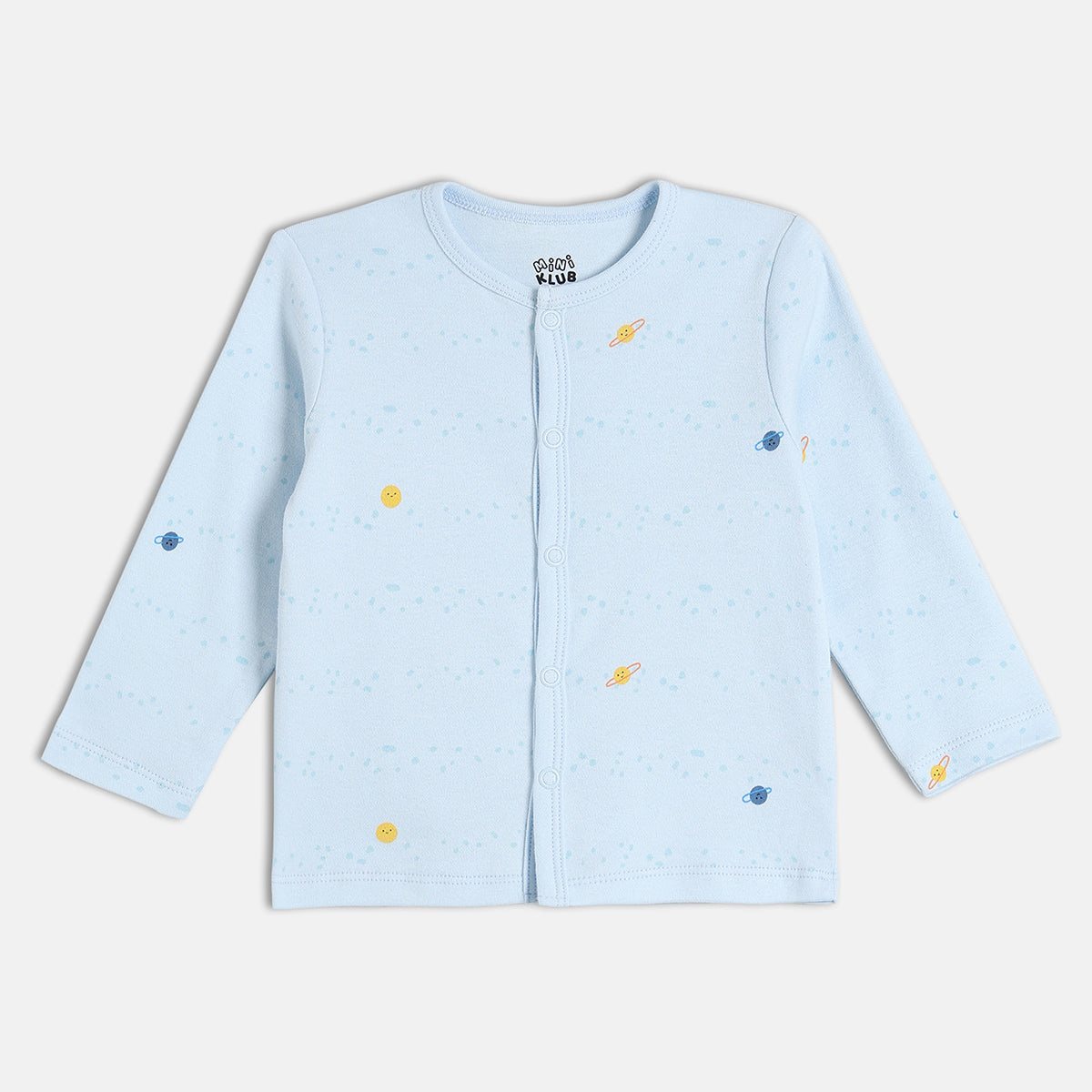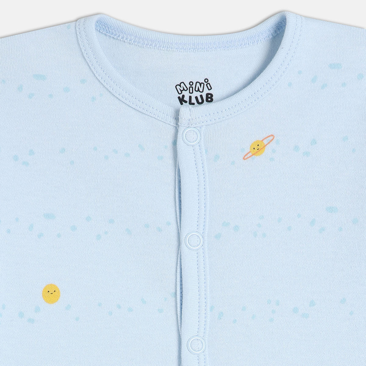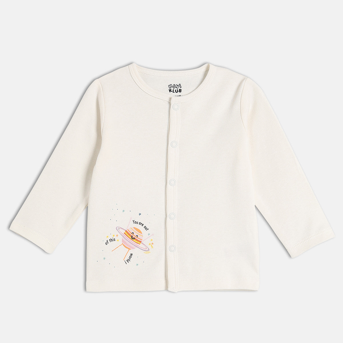 This adorable pack of two front-open knit vests combines comfort with a fun, space-themed design. Made from soft, breathable cotton knit fabric, one vest features an all-over planet print on a soothing blue base, while the other comes in a cream color with a cute UFO graphic. Perfect for layering, these vests keep your little one cozy and stylish.