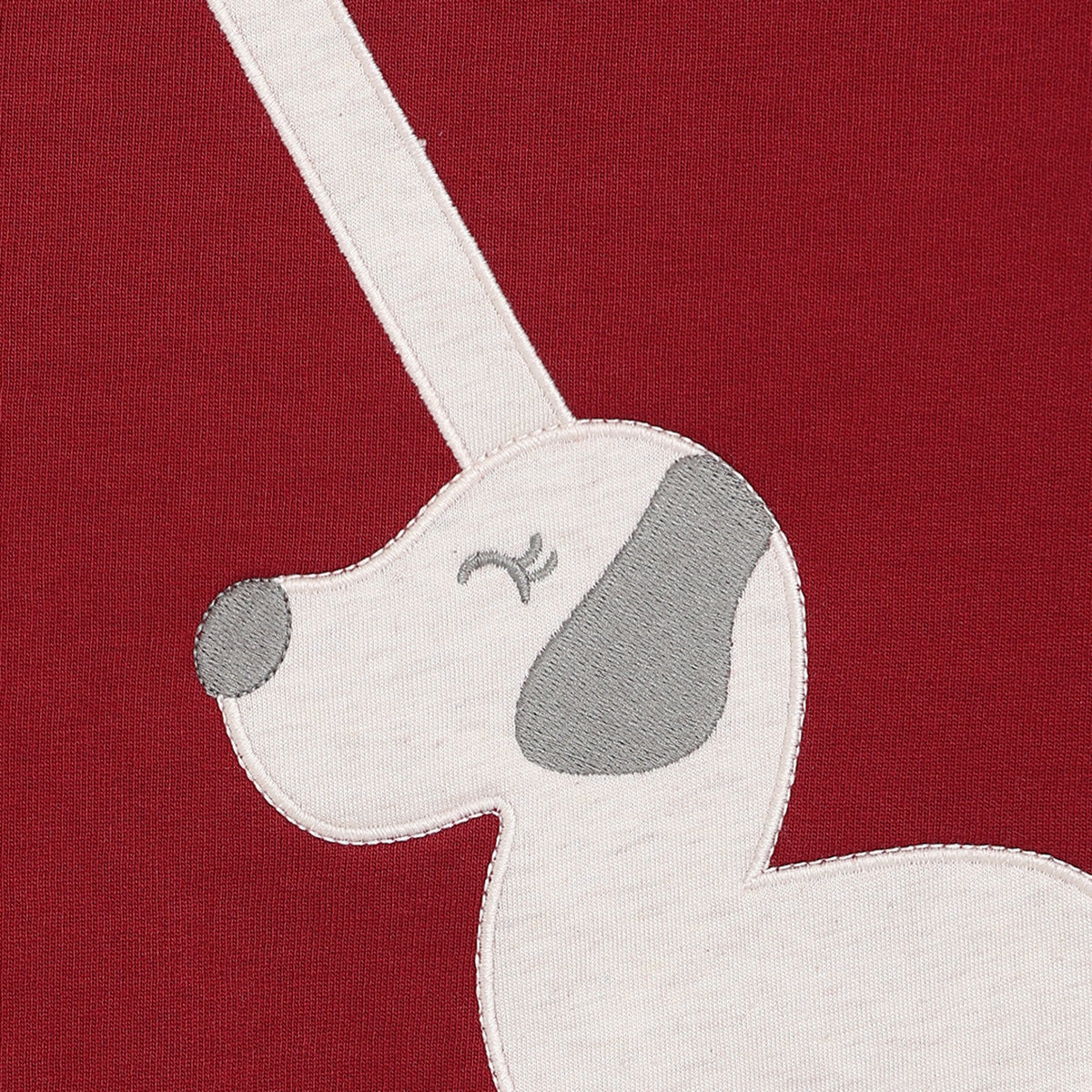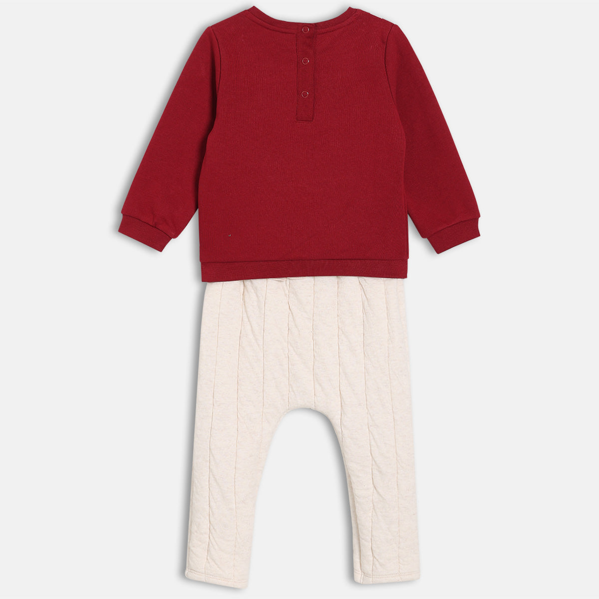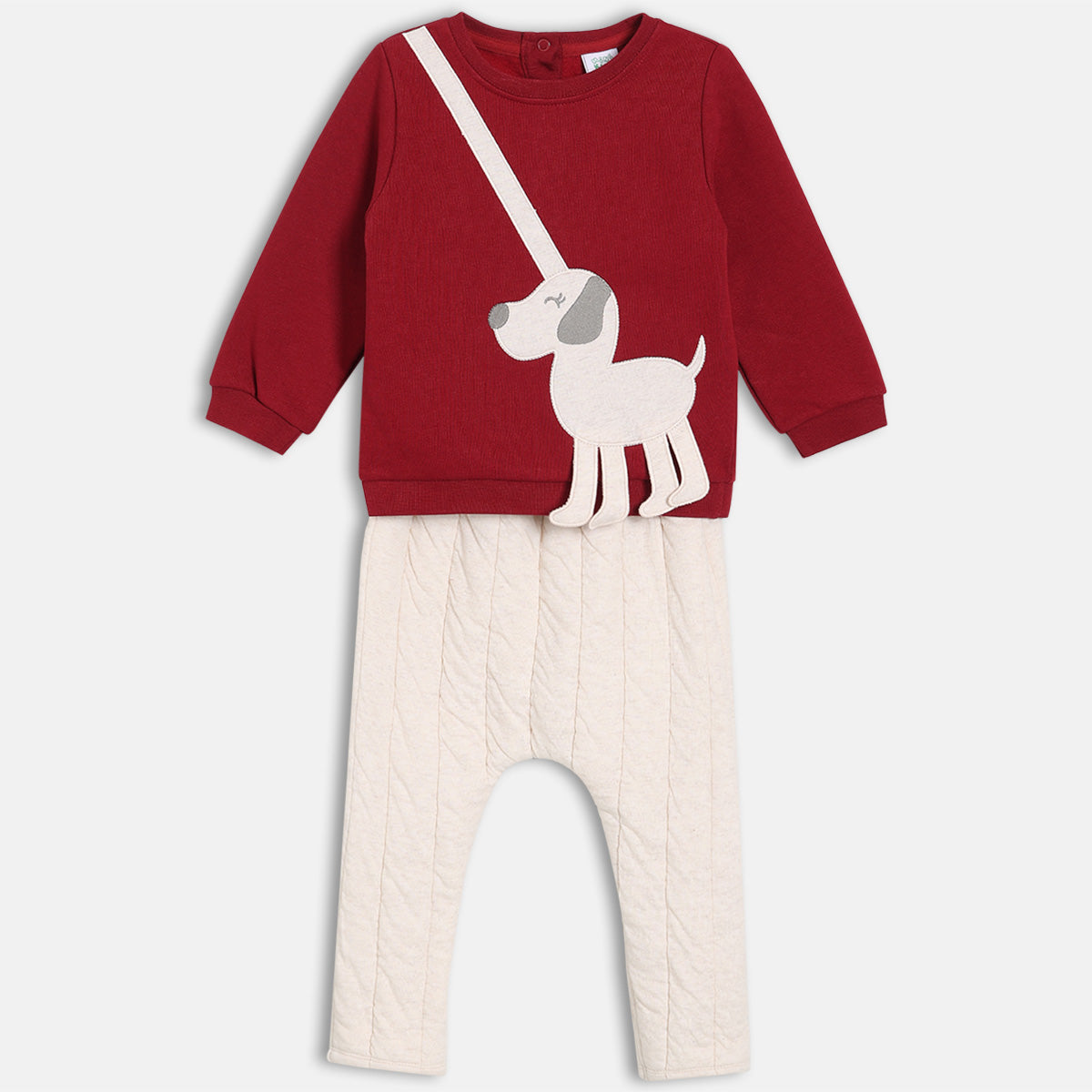 Dress your little one in playful comfort with this adorable two-piece set. The outfit includes a maroon full-sleeve top featuring a cute dog applique design that extends onto the cream quilted pants, creating a fun and coordinated look. Made from soft, breathable fabric, this set ensures warmth and ease of movement — perfect for playtime or casual outings.