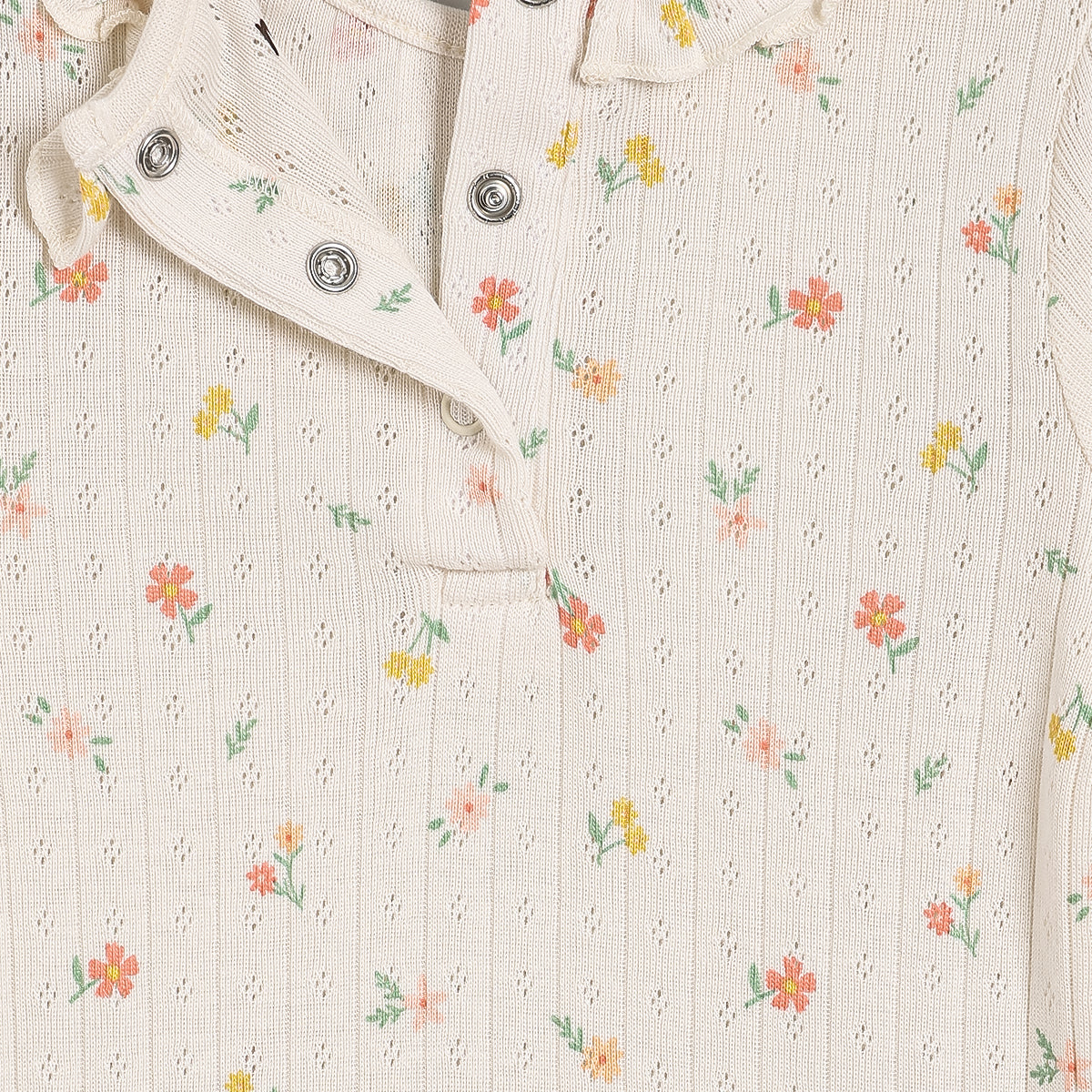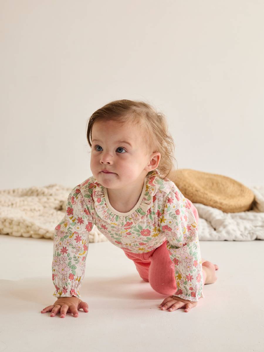 - Sprig Print Bodysuit: A soft sprig-inspired all-over pattern on a neutral base, complete with frill neckline, gathered sleeves, and elasticated cuffs.