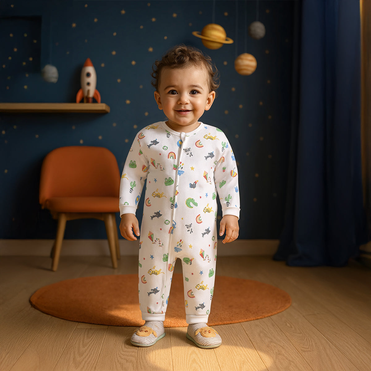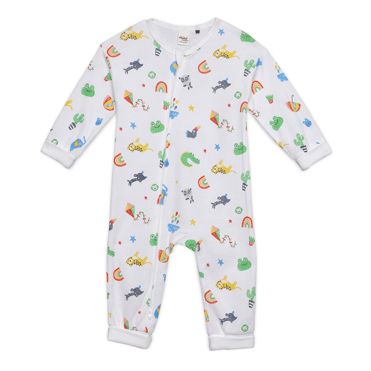 This charming all-over printed romper brings a splash of colour and fun to your baby’s everyday wear. Adorned with playful motifs like rainbows, animals, and stars, it adds a cheerful and lively vibe to your little one’s wardrobe. Designed with a front snap-button opening, it offers easy dressing and quick diaper changes. The full sleeves and soft cuffed hems provide added comfort and warmth, making it a perfect choice for both day and night wear.
