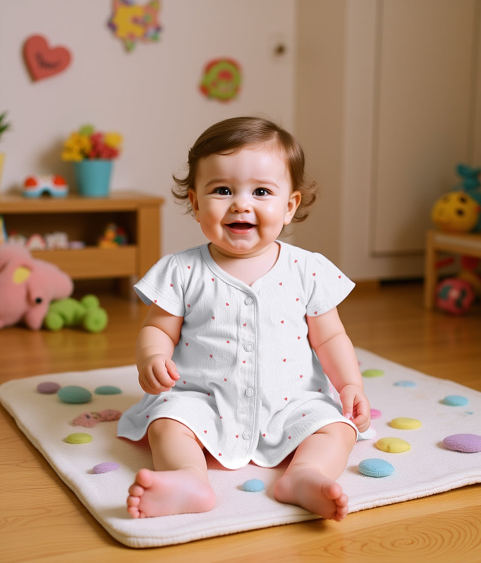 This baby girls front open dress set is thoughtfully designed for everyday comfort and easy dressing. Crafted from soft, breathable fabric, both dresses feature a convenient front button opening that makes changing quick and fuss-free. The set includes one solid dress and one delicately printed dress, offering versatile options for daily wear and comfortable lounging.