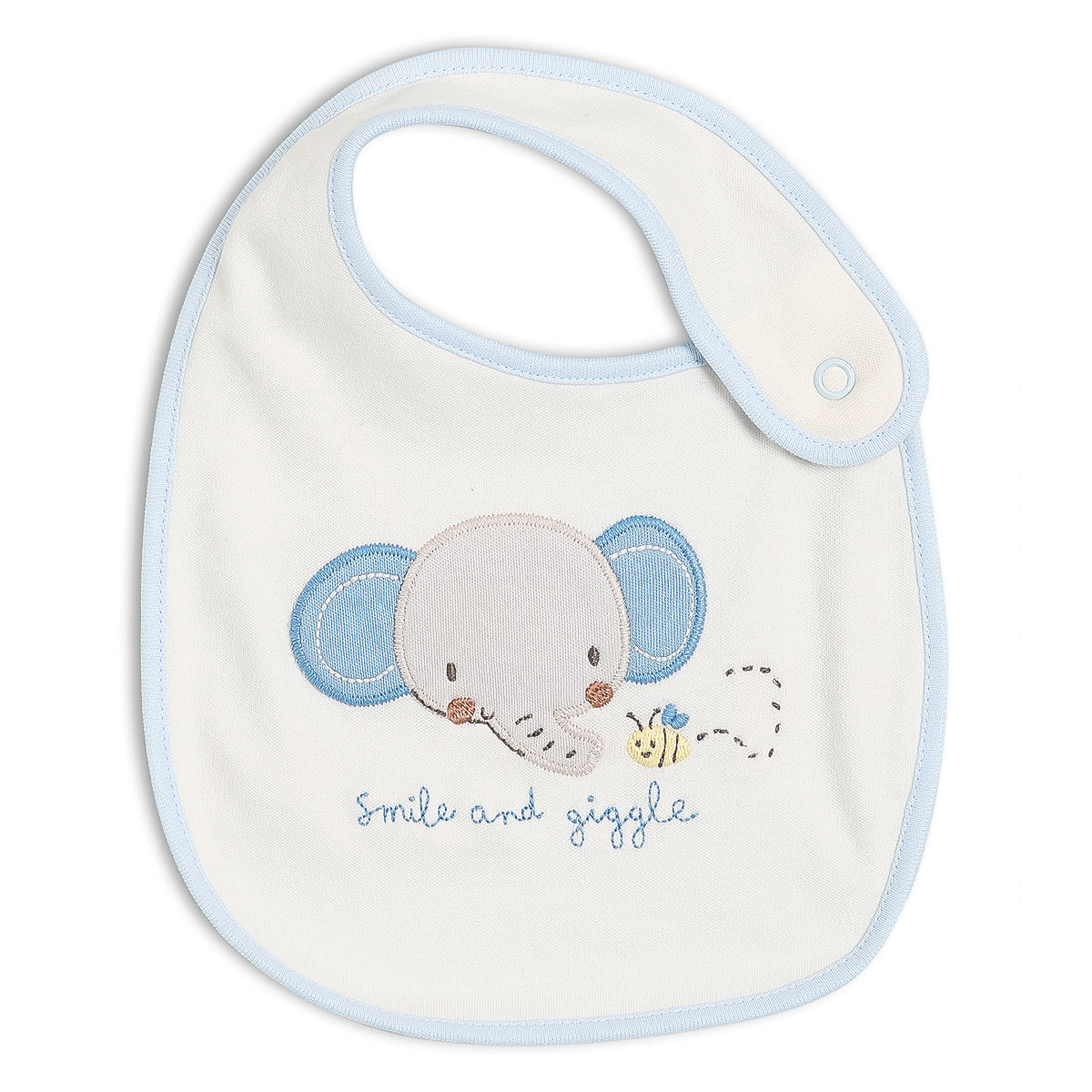 - Little Dribbles – sweet elephant embroidery and starry reverse, featuring a soft snap fastening for fuss-free changes.