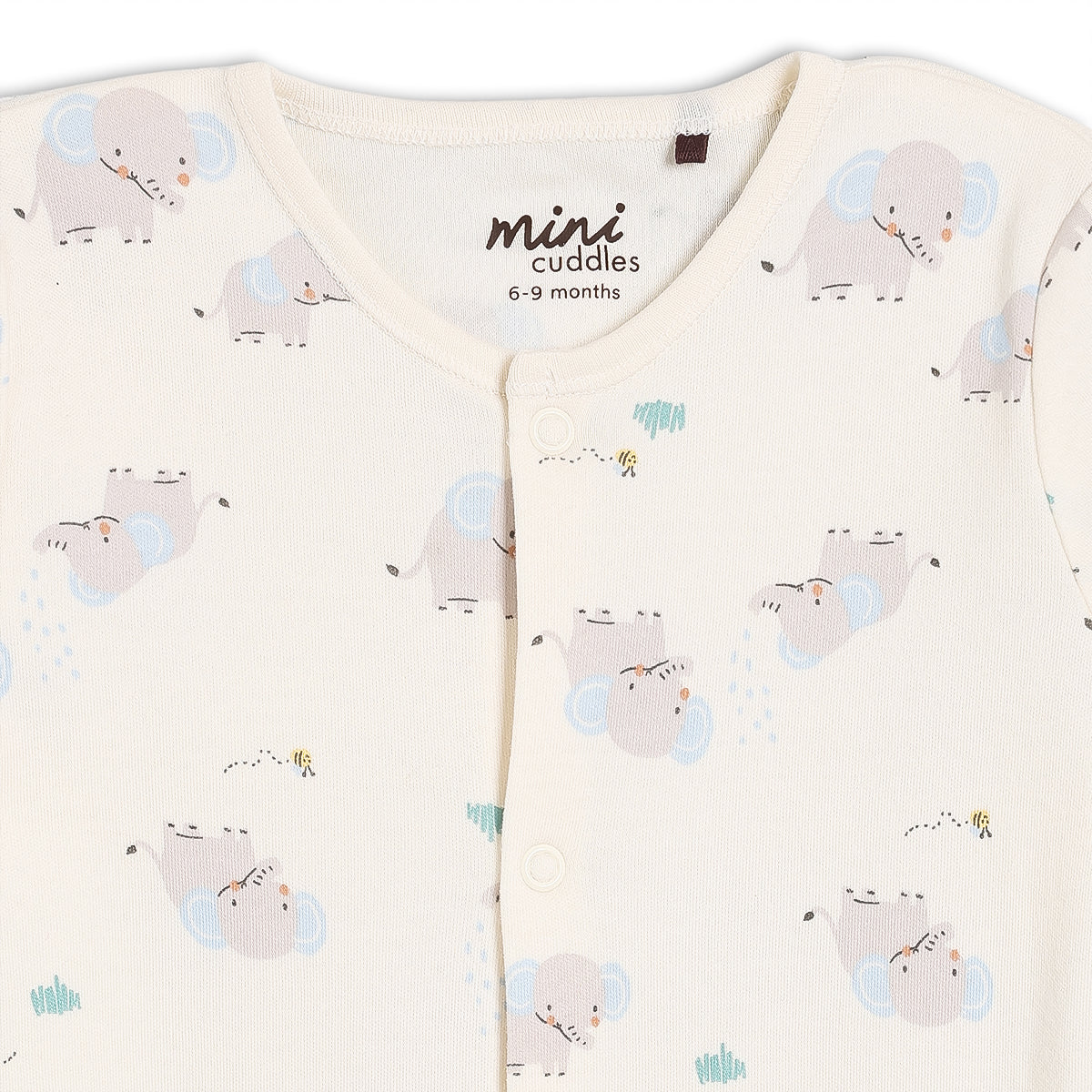 - Sleepsuit – 100% cotton interlock with all-over playful elephant print, popper fastening for quick changes, attached scratch mitts, and cosy enclosed feet.