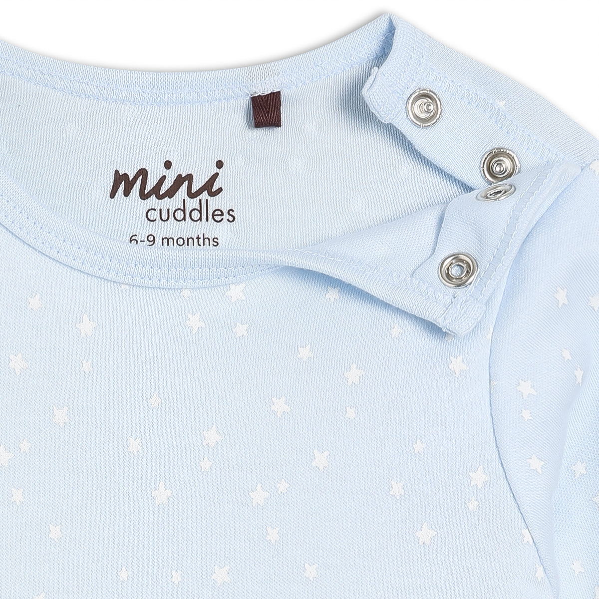 - Bodysuit – Soft cotton jersey in a star print with shoulder poppers and “Grow with Me” extra poppers for a longer fit.