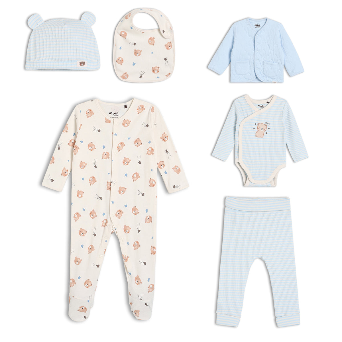 Wrap your little one in cosy comfort with our Blue Bear 6-Piece Baby Essentials Gift Set – a perfect blend of softness, practicality, and sweet bear-themed details. Made from baby-safe cotton fabrics with an extra-soft hand feel, this coordinated set is designed for everyday wear, gifting, and those first precious moments.