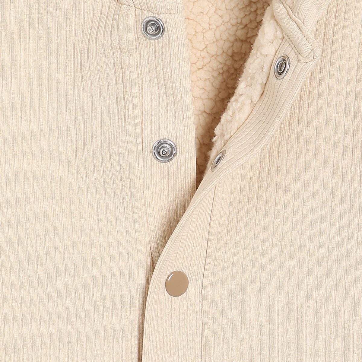 This adorable beige hooded jacket is crafted from soft, ribbed fabric for a cozy and stylish look. It features a plush sherpa lining that provides extra warmth, making it perfect for chilly days. The front snap button closure ensures easy dressing, while the contrasting pocket detail adds a touch of charm and functionality. Designed for both comfort and practicality, this jacket is ideal for everyday wear during cooler seasons.