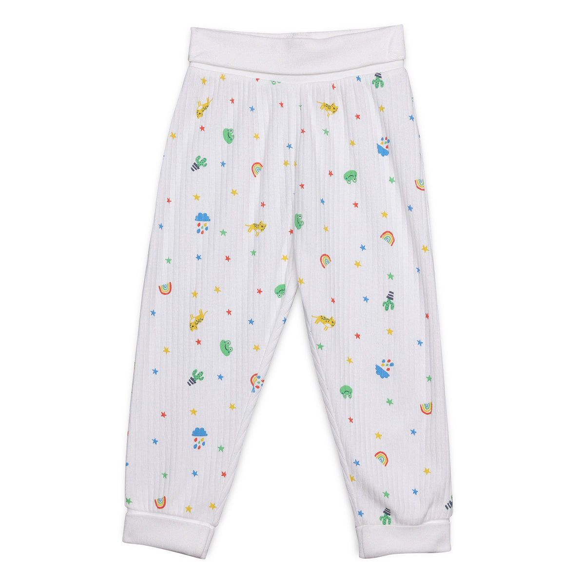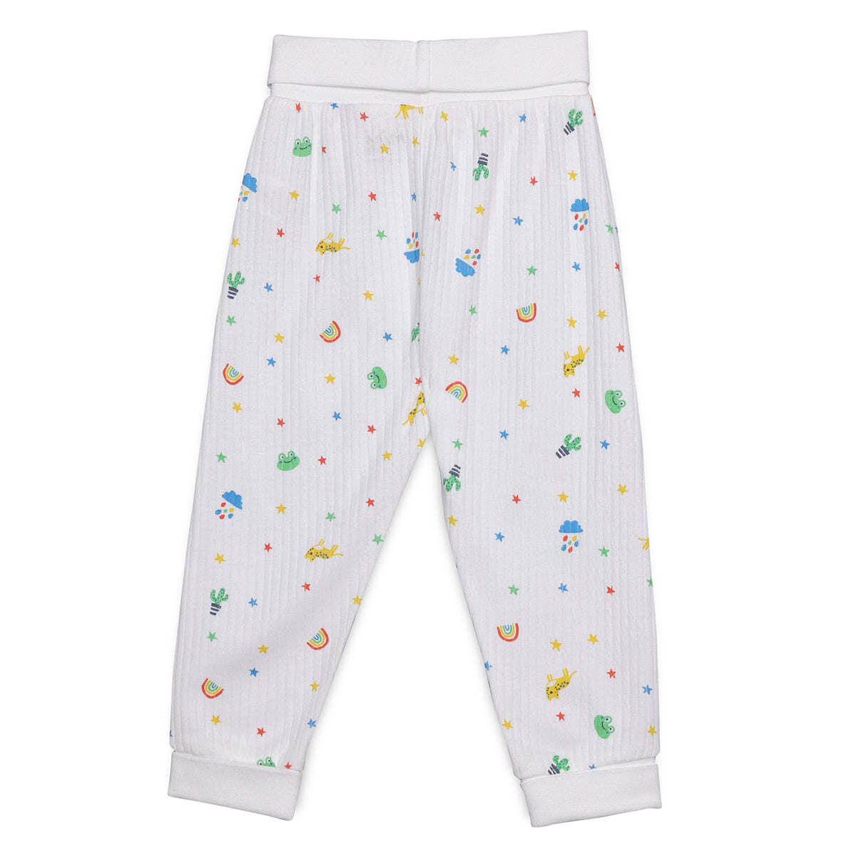 This pack of three baby bottoms combines playful style with everyday comfort. Each pair features a unique design , a bright solid colour, a fun all-over print, and a star pattern , offering versatile mix-and-match options. Designed with soft stretchable waistbands and ankle cuffs, these bottoms ensure a secure yet gentle fit for active little ones. Perfect for pairing with T-shirts or vests, they provide all-day comfort for playtime or lounging at home. Orange Ribbed Pant – Bright orange pant crafted in soft ribbed cotton for a cozy and comfortable fit, perfect for everyday wear. White All-Over Print Pant – White pant featuring fun all-over prints of rainbows, stars, and cute motifs, adding a playful touch to your baby’s outfit. Green Star Print Pant – Vibrant green pant with an all-over star print design, made from breathable cotton fabric for comfort throughout the day.
