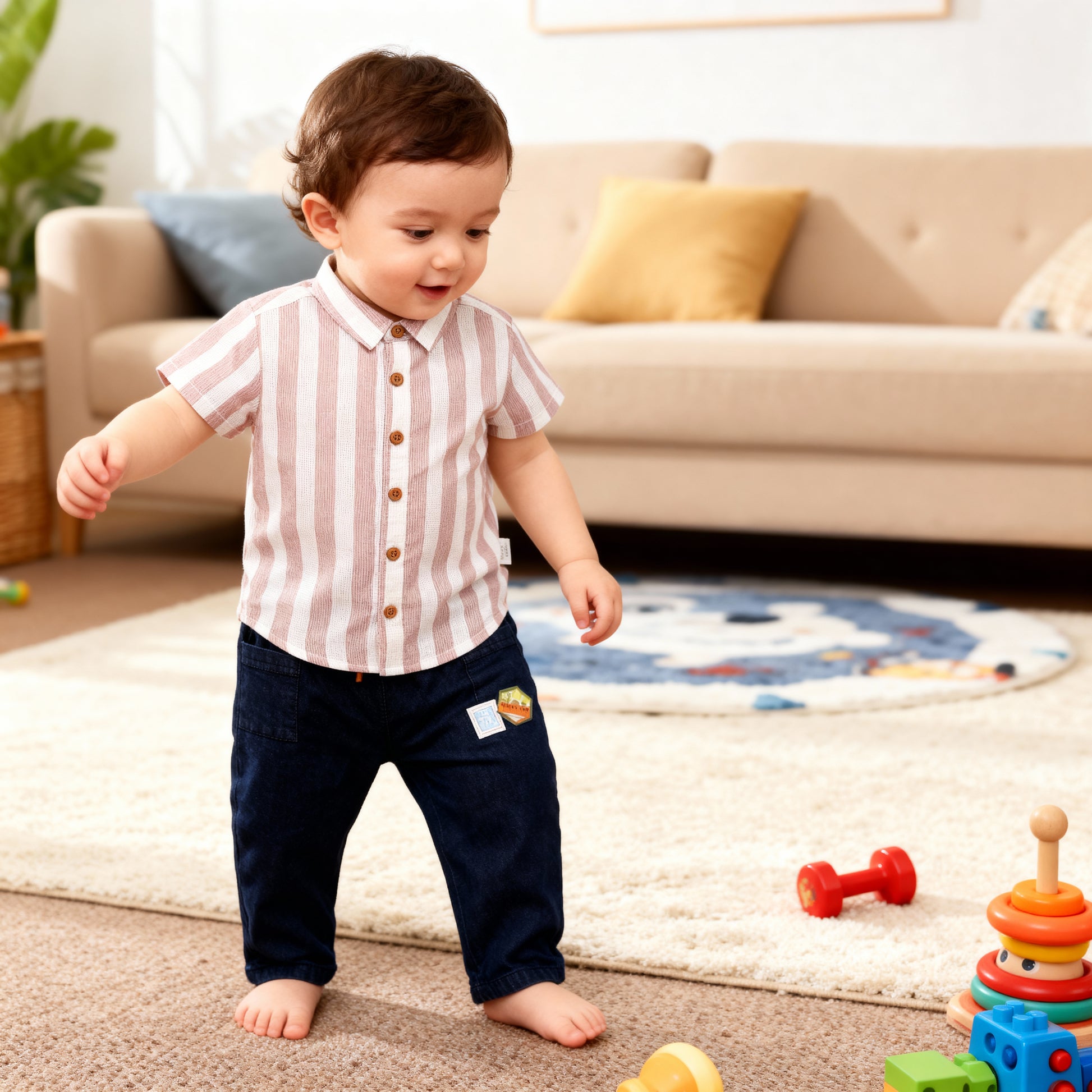This baby boys striped shirt is a stylish blend of comfort and classic design. Featuring soft vertical stripes in warm brown and white tones, the shirt comes with short sleeves, a neat collar, and a front button closure that adds a smart finish. The subtle textured weave enhances its overall look while keeping it breathable.