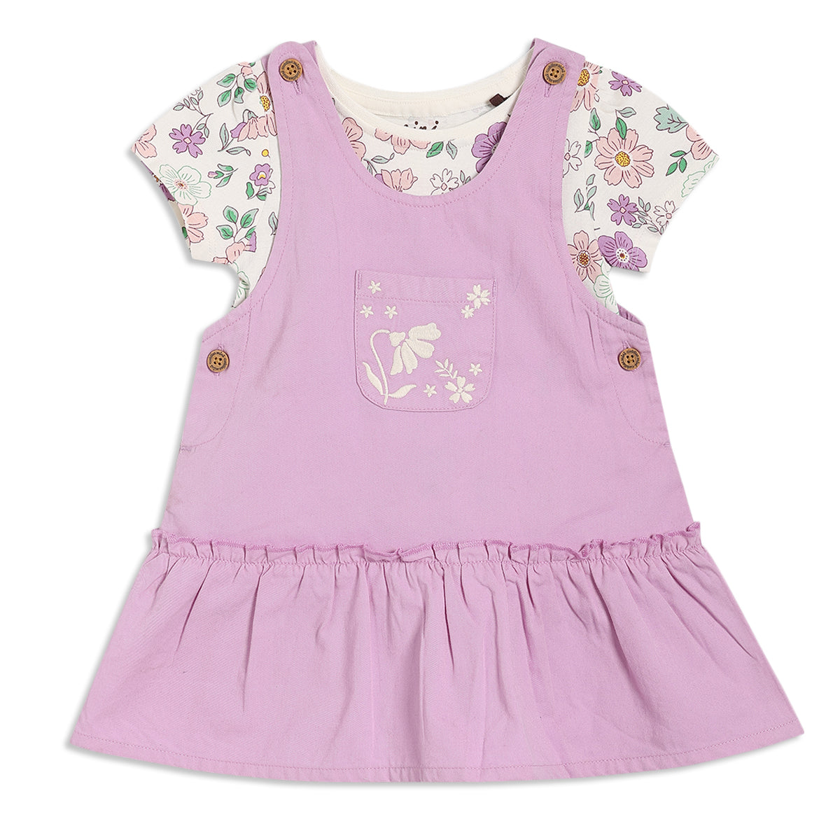 This baby girls pinafore dress set is perfect for cheerful everyday dressing. The set includes a soft floral printed t-shirt paired with a solid pinafore Pinny featuring delicate embroidery on the front pocket. Designed for comfort and ease, the adjustable shoulder button closures allow a comfortable fit, while the gathered waist adds a playful silhouette. Ideal for outings, playtime, or casual occasions.