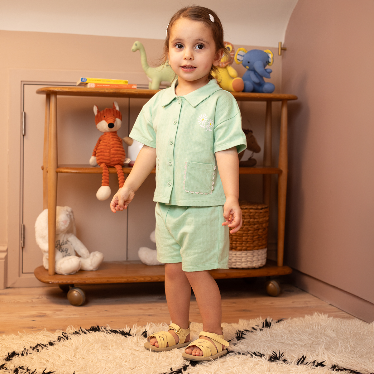 This adorable mint green top and bottom set brings effortless charm to your little one’s everyday look. The collared top features dainty floral embroidery and button-down styling, perfectly paired with matching shorts for a coordinated and comfortable outfit. Ideal for playtime or casual outings.