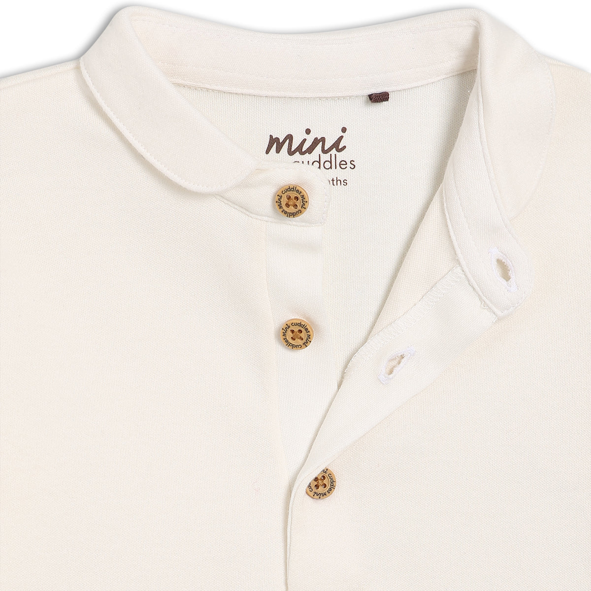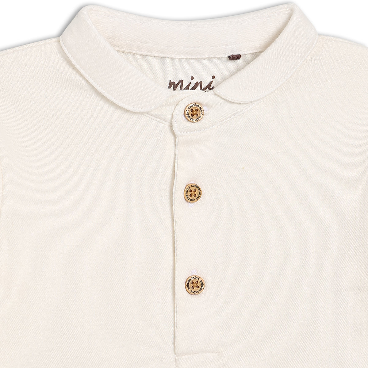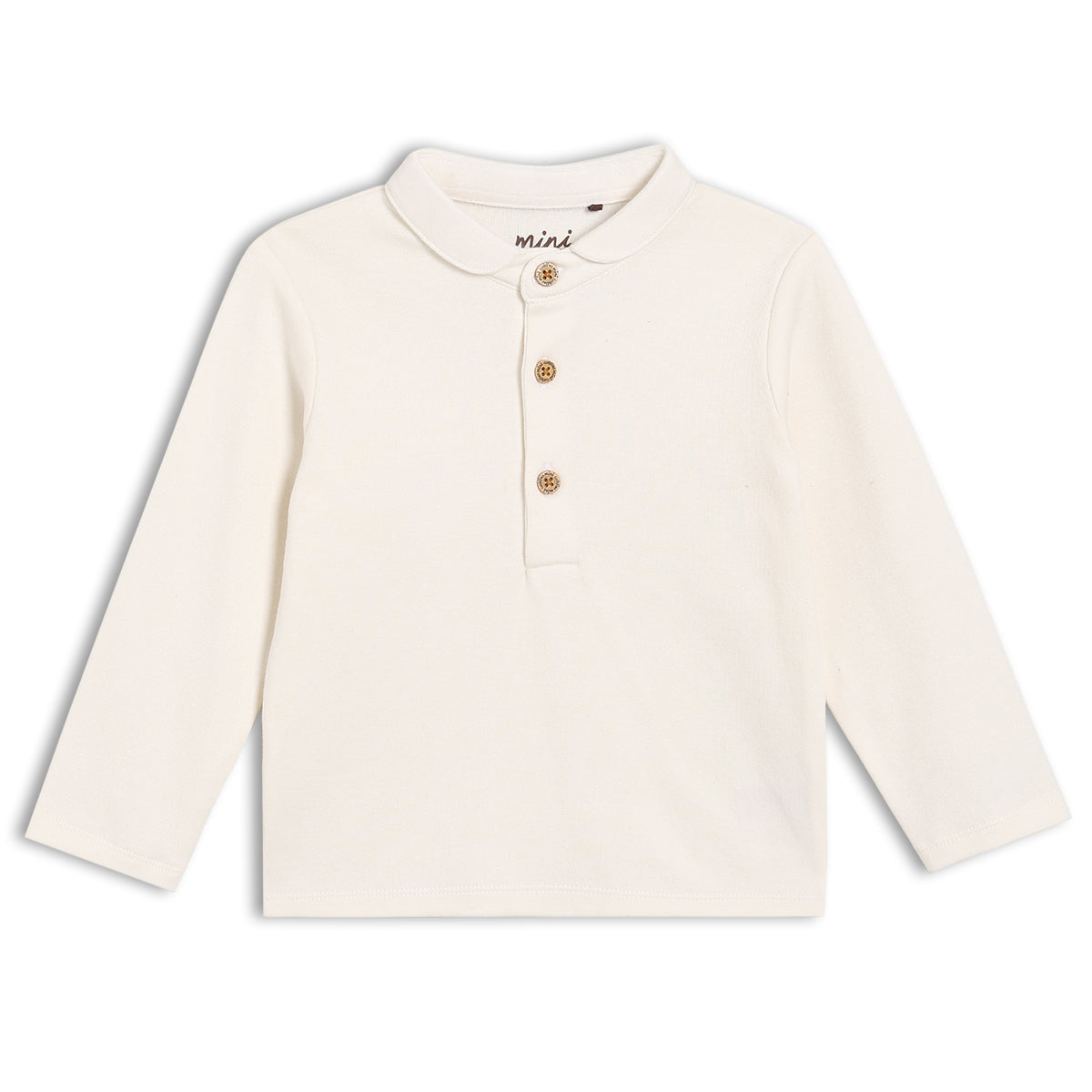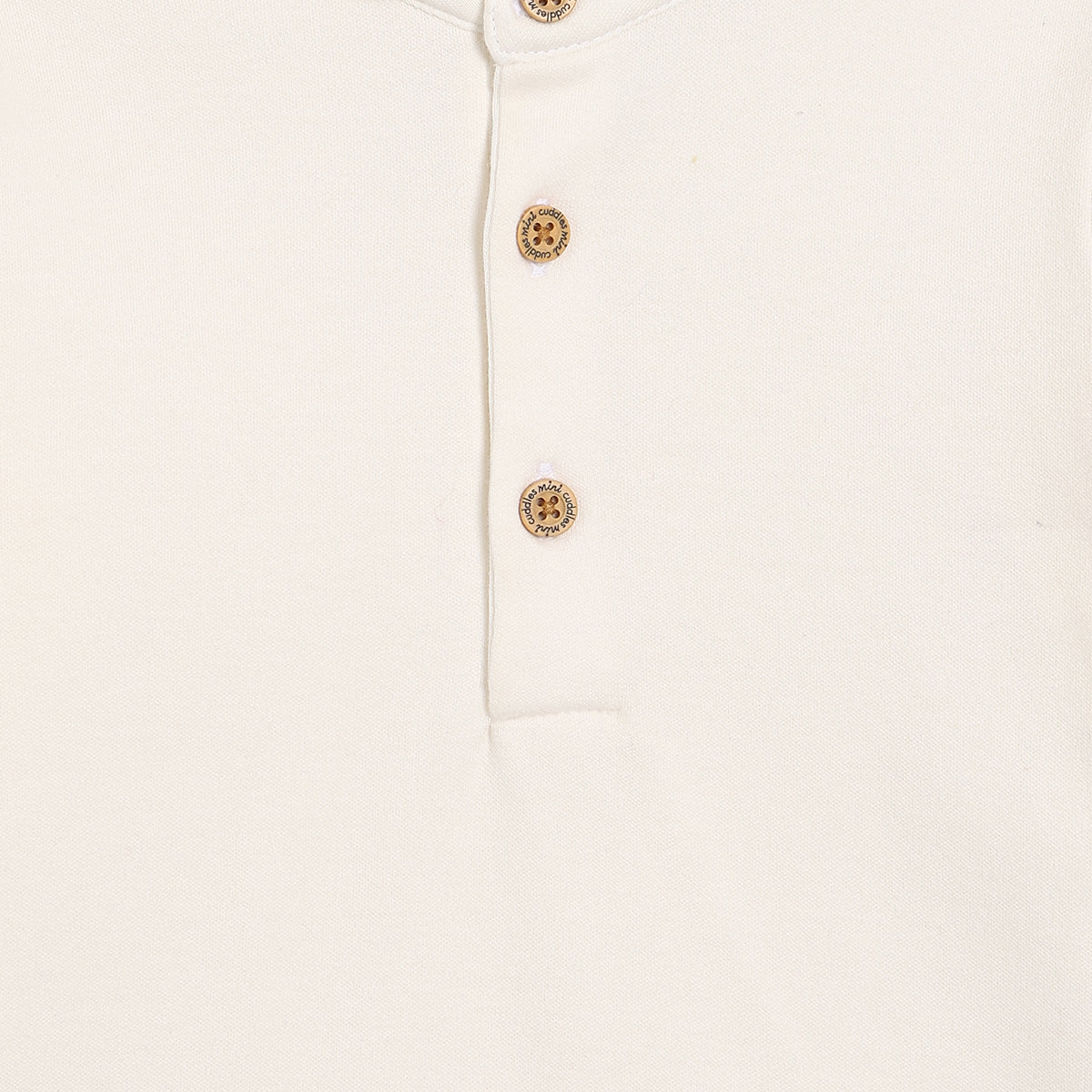 T-Shirt – Made from 100% BCI cotton interlock with a Peter Pan collar and wooden button placket, offering a soft hand-feel and easy wear.