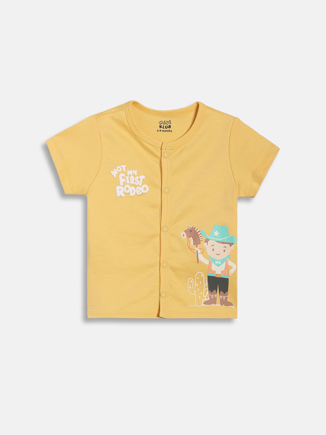 This comfortable pack of two front open vests is designed to keep your little one cool and happy through the day. One vest features a playful cowboy-themed placement print on a yellow base, while the other comes with an all-over western-inspired print on a refreshing mint green base. Made for everyday comfort, these vests are gentle on baby’s skin and ideal for layering or wearing on their own.