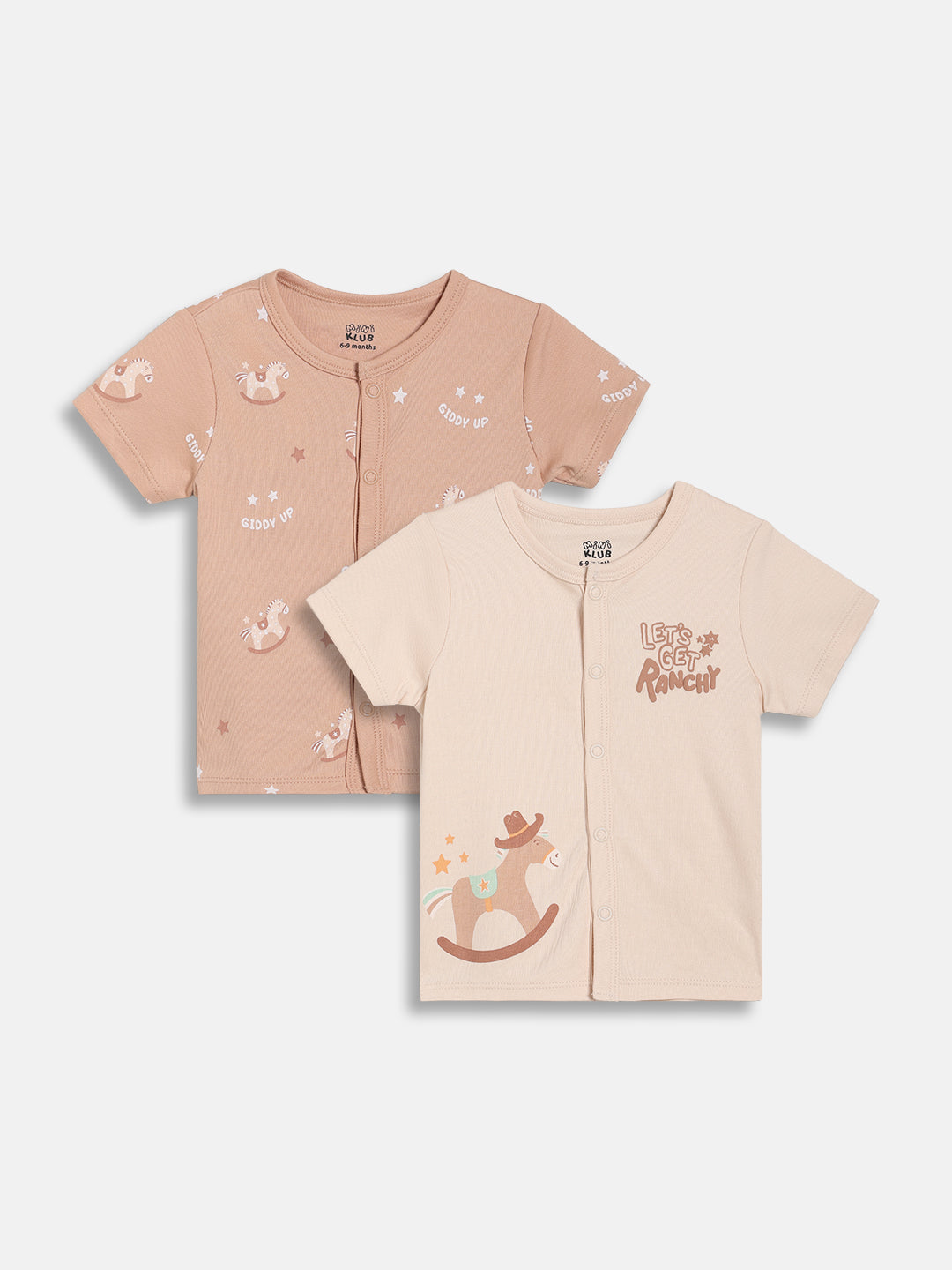 This charming pack of two front open vests brings a playful western-inspired vibe to your baby’s everyday essentials. One vest features an all-over print with rocking horse and star motifs on a warm brown base, while the other comes with a cute placement print on a soft beige base. Designed for comfort and ease, these vests are perfect for daily wear, lounging, or layering.