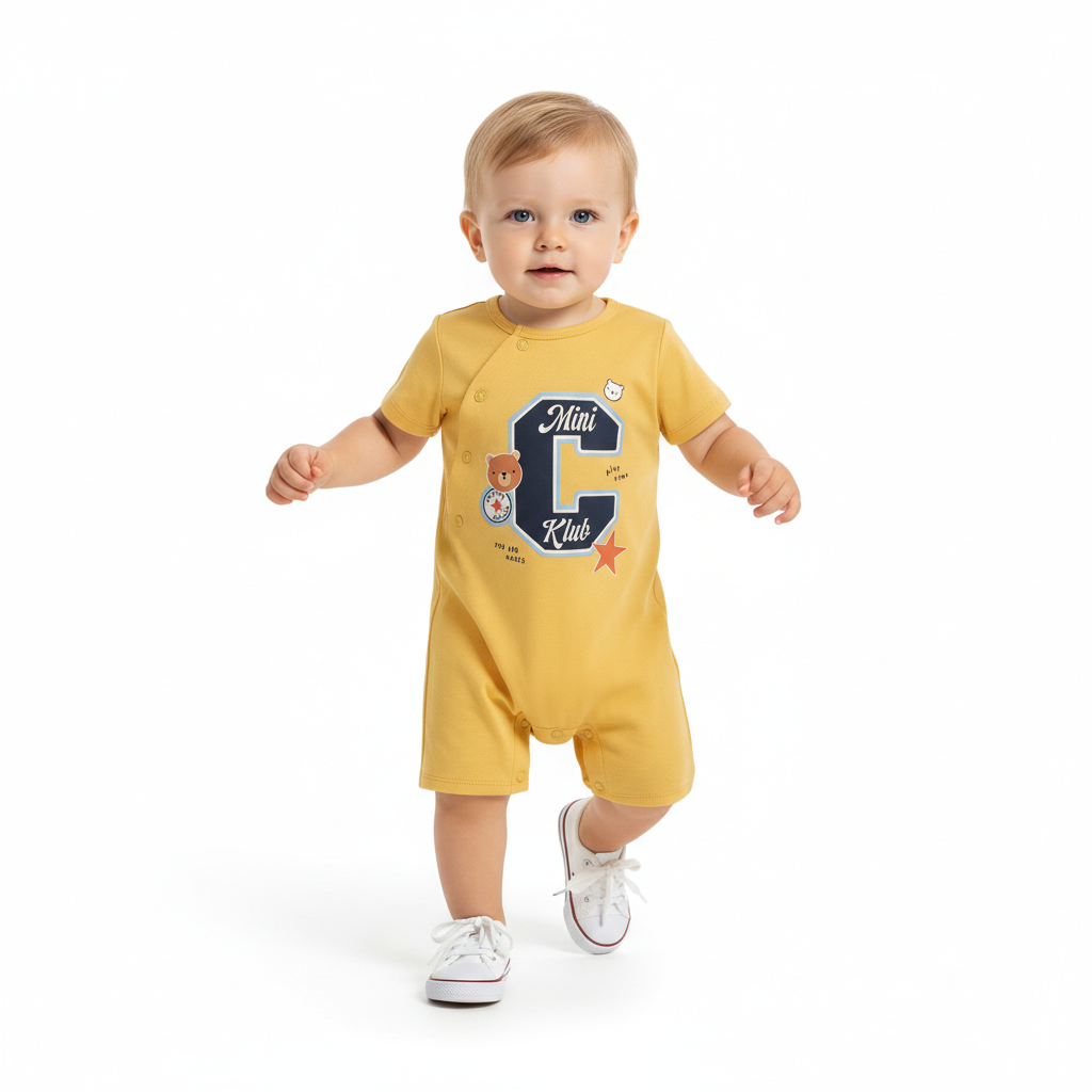 Keep your little one comfy and cute with this pack of 2 short sleeve rompers. The yellow romper features a playful “Mini C Klub” graphic with adorable character details, while the navy blue romper comes with an all-over star print and bold “LA” placement design. Designed with convenient snap button closure for easy dressing and quick nappy changes, these rompers are perfect for everyday wear, playtime, and cozy naps.