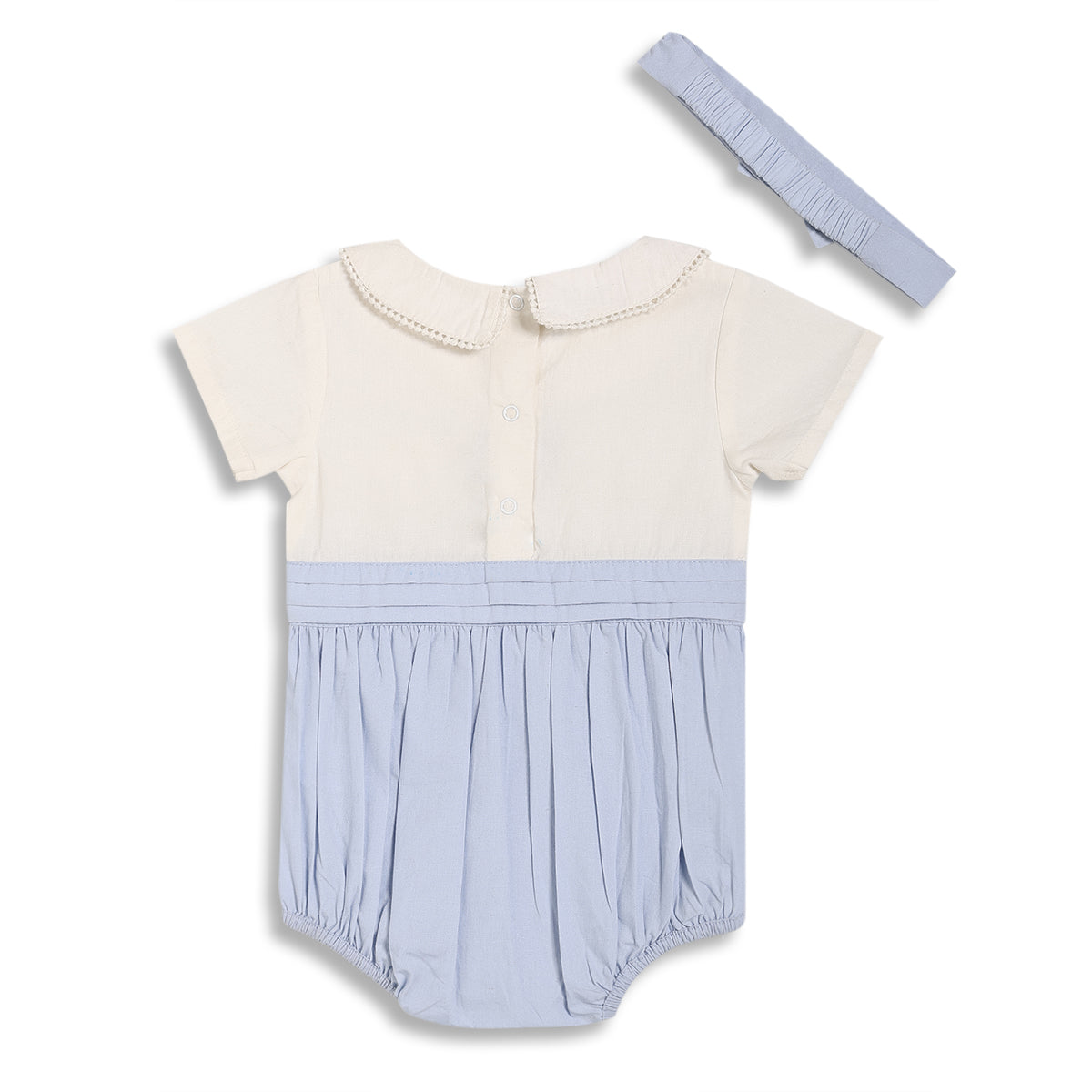 Dress your little one in charming elegance with this baby girls bodysuit featuring a soft off-white and pastel blue colour combination. Designed with a delicate Peter Pan collar and an adorable sea shell embroidery that reads “Sea Princess”, this bodysuit brings a playful yet graceful look. The gathered lower panel ensures comfort and ease of movement, while the snap button opening allows for quick and hassle-free diaper changes. Complete with a matching headband, it makes a perfect choice for special occasions as well as comfortable day wear.