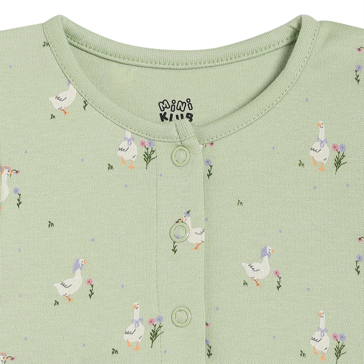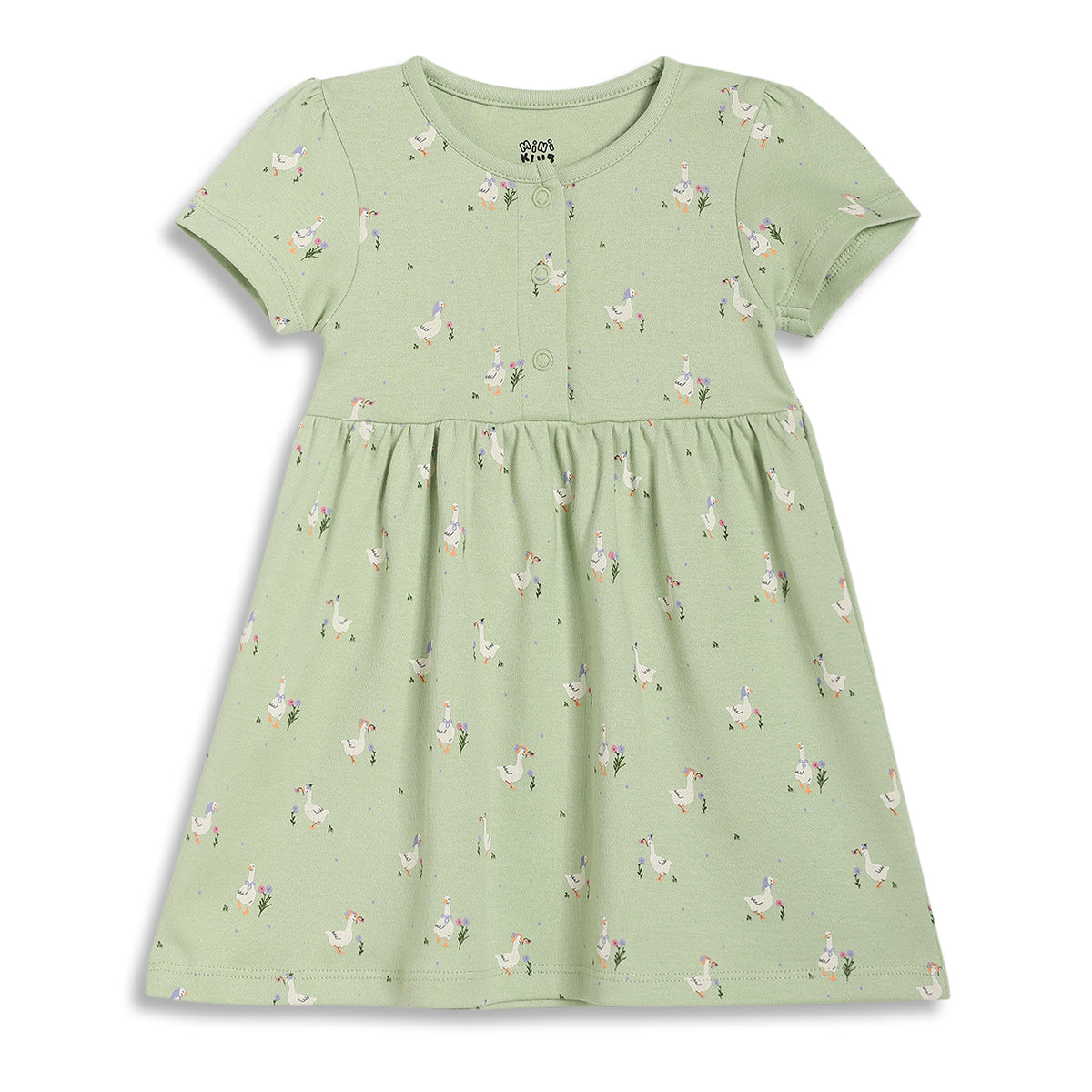 Add cheerful charm to your little one’s everyday wardrobe with this baby girls knit dress pack of two. Designed for comfort and ease, both dresses feature a front open snap button placket for quick dressing and easy changes. One dress comes in a soft green shade with all-over duck and floral prints, while the other is styled in a sunny yellow hue with playful butterfly prints and striped detailing on the skirt. Made from soft, breathable cotton fabric, these dresses are ideal for daily wear and gentle on baby’s delicate skin.