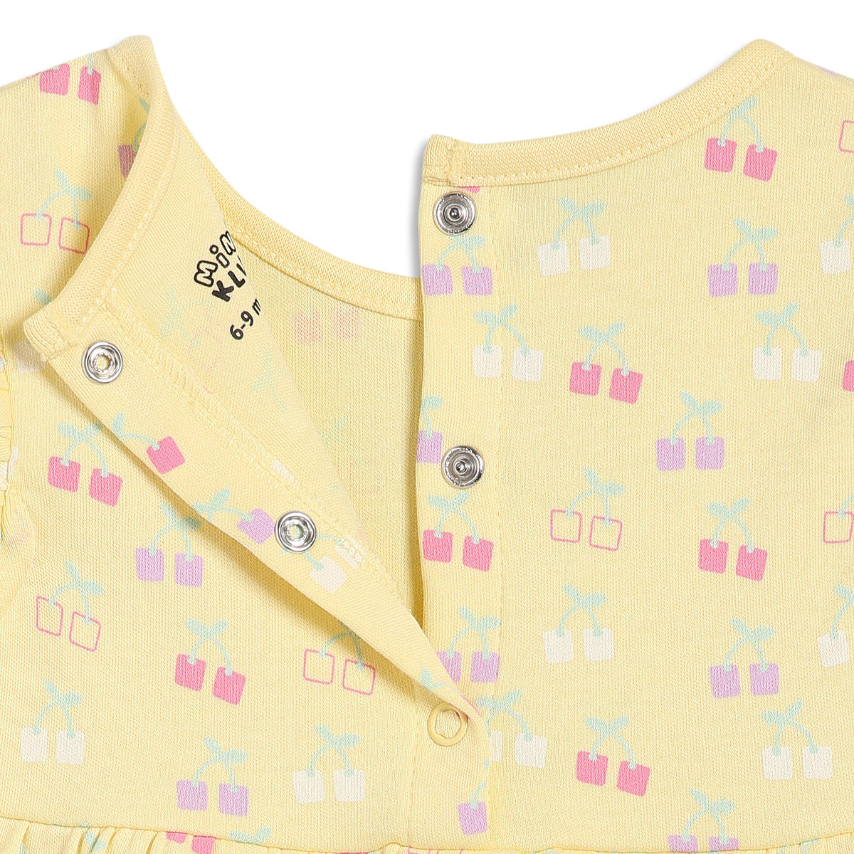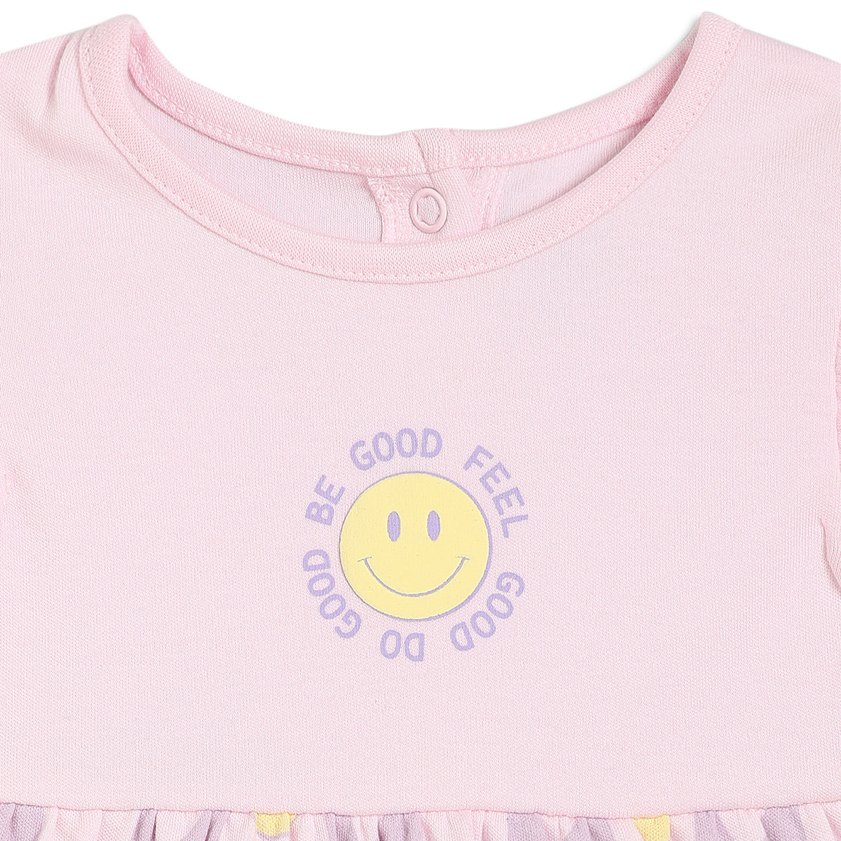 Dress your little one in cheerful comfort with this adorable pack of two baby girls’ dresses. Designed with soft pastel shades, one dress features an all-over cherry print in yellow, while the other comes in a gentle pink tone with a playful smiley and heart check pattern. The flutter sleeves and gathered waist add a charming silhouette, making these dresses perfect for everyday wear, playtime, or casual outings.