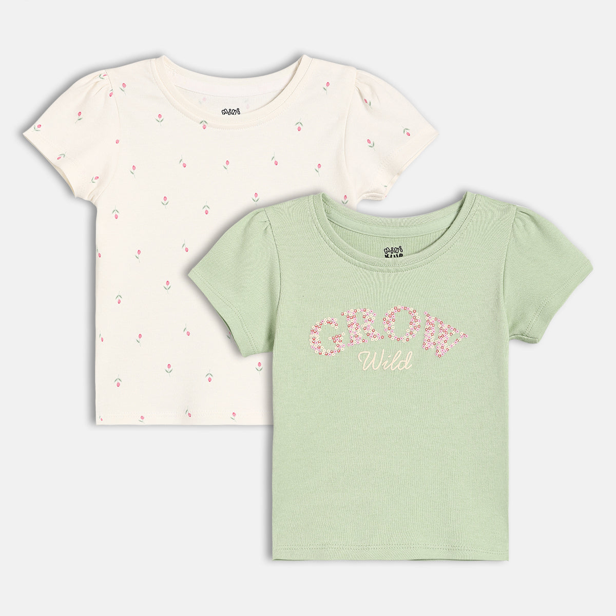 Brighten up your little one’s everyday wardrobe with this baby girls knit top pack of two. Crafted from soft and breathable cotton fabric, these tops are designed to keep your baby comfortable all day long. One top comes in a soothing mint green shade featuring a charming “Grow Wild” floral print, while the other is styled in an off-white base with delicate all-over floral motifs. With a comfortable round neckline and easy pull-on style, these knit tops are perfect for daily wear and gentle on baby’s delicate skin.