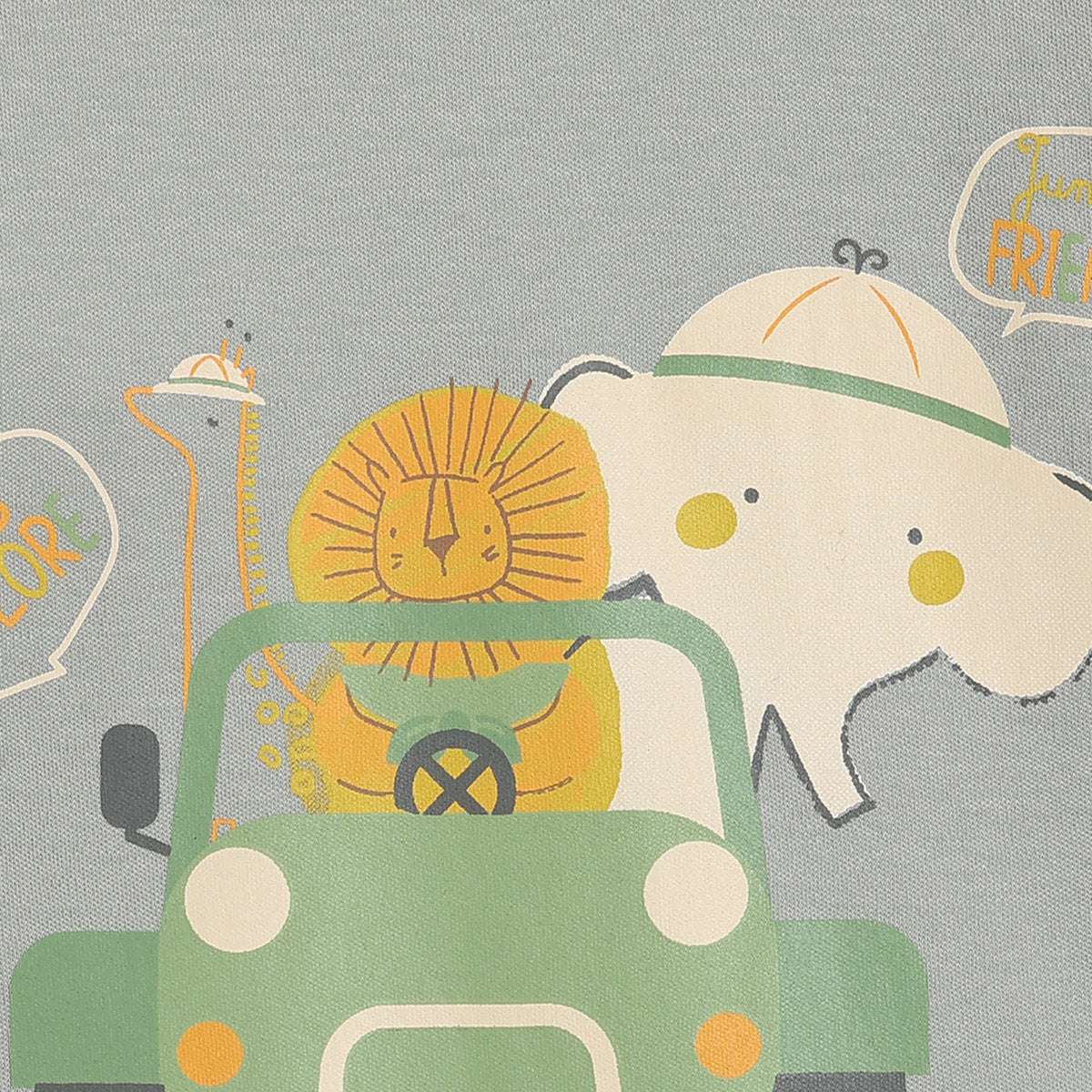 This pack of 2 full-sleeve T-shirts is perfect for everyday comfort with a touch of playful charm. Made from soft, breathable cotton, the set includes one green striped T-shirt for a cheerful look and one grey T-shirt featuring a cute safari-themed animal print. Designed for all-day wear, these tees offer a relaxed fit that keeps your little one cozy during playtime or casual outings.