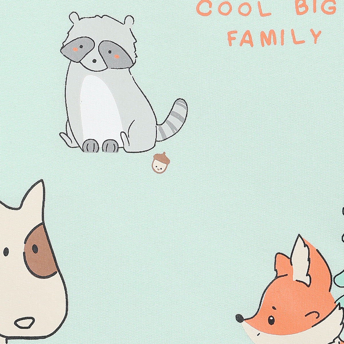 Keep your little one comfy and cute in this pack of 2 full-sleeve printed t-shirts for boys, perfect for everyday wear. Made from soft and breathable cotton fabric, these tees ensure gentle comfort on delicate skin. The set includes one blue t-shirt with a playful “Happy With You” acorn print and one mint green t-shirt featuring adorable forest animal graphics and “Cool Big Family” text. Designed with shoulder snap buttons for easy dressing, these t-shirts add both fun and convenience to your baby’s wardrobe.