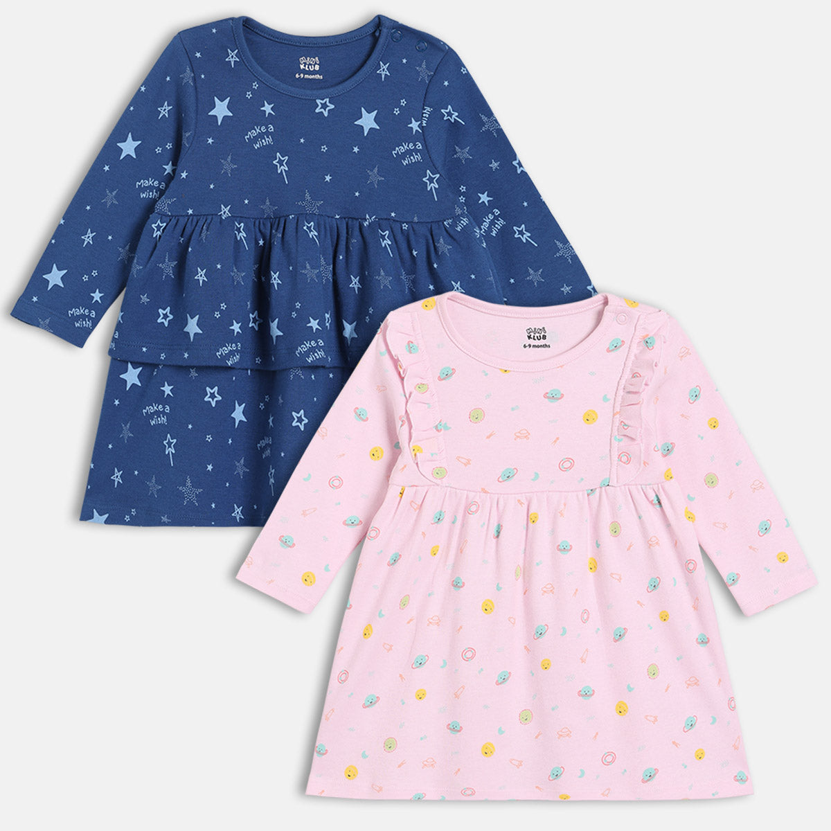 Dress your little one in absolute comfort and cuteness with this pack of two baby girl frocks. The set includes one navy blue dress with a charming “Make a Wish” star print and a tiered flared design, and one light pink dress featuring an all-over space-themed print with subtle ruffle detailing on the chest. Crafted from 100% soft and breathable cotton, these dresses ensure gentle comfort for delicate baby skin. The full-sleeve design keeps your baby warm, while the easy pull-over style makes dressing quick and fuss-free. Perfect for daily wear, playdates, or casual outings, these dresses blend style, comfort, and practicality beautifully.