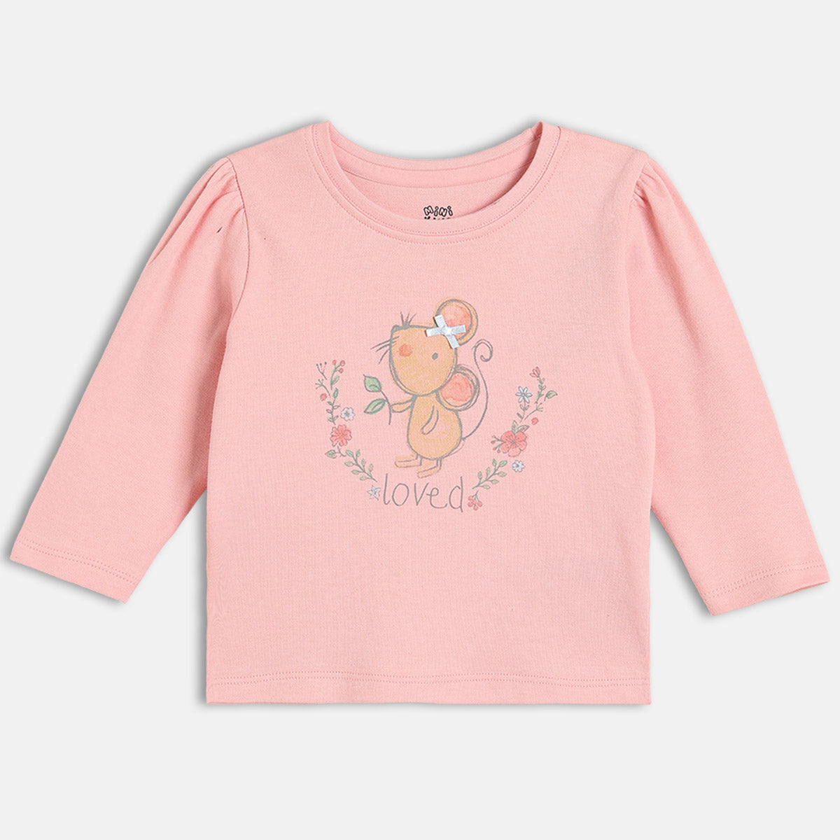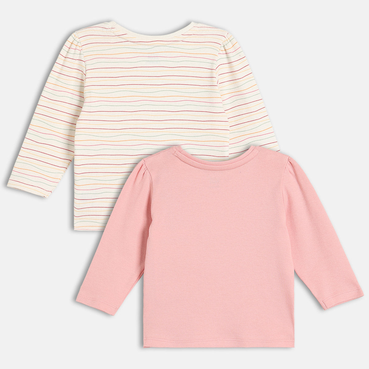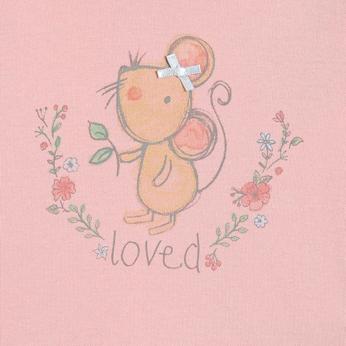 Dress your baby girl in adorable comfort with this pack of 2 full-sleeve Tops . The set includes one soft pink tee featuring a sweet mouse print surrounded by floral detailing and the word “Loved,” and one cream-colored tee with multicolored wavy stripes for a playful touch. Crafted from 100% premium cotton, these tops are soft, breathable, and gentle on delicate skin—perfect for everyday wear. With their easy round neckline and comfy relaxed fit, these tees are ideal for pairing with leggings, shorts, or skirts for a cute and cozy look all day long.