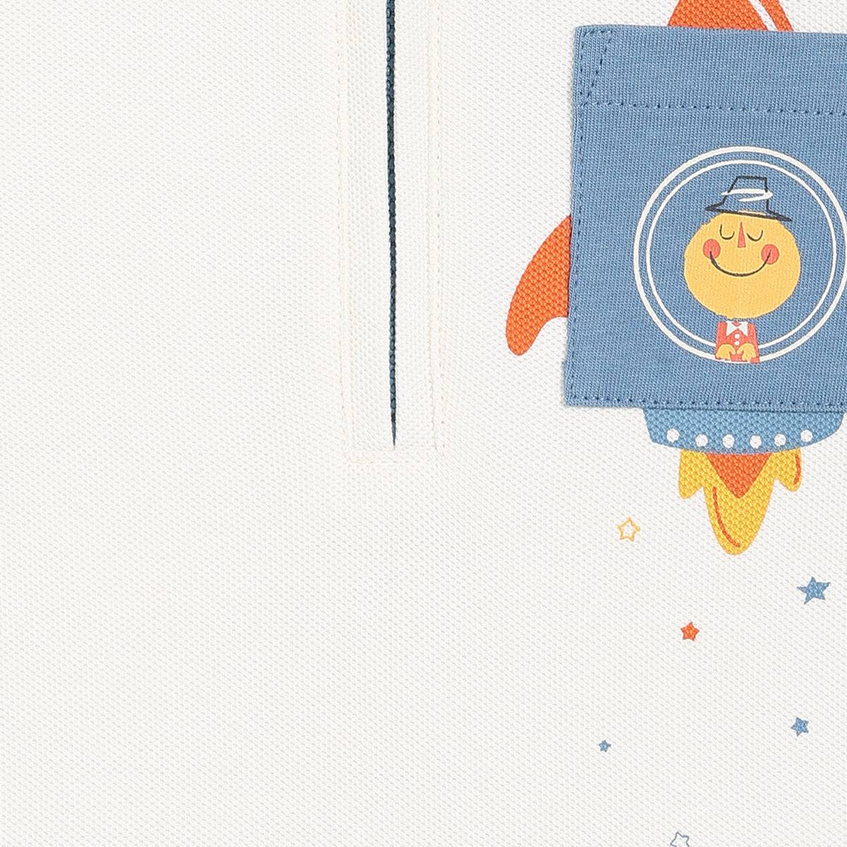This adorable polo T-shirt is perfect for your little space explorer! Designed with blue striped sleeves and a solid white body, it features a fun rocket and astronaut print with a small front pocket for a playful touch. The half-zip closure and contrast blue collar add a trendy, sporty vibe. Made from soft, breathable cotton fabric, this full-sleeve tee ensures all-day comfort—ideal for casual outings and everyday adventures.