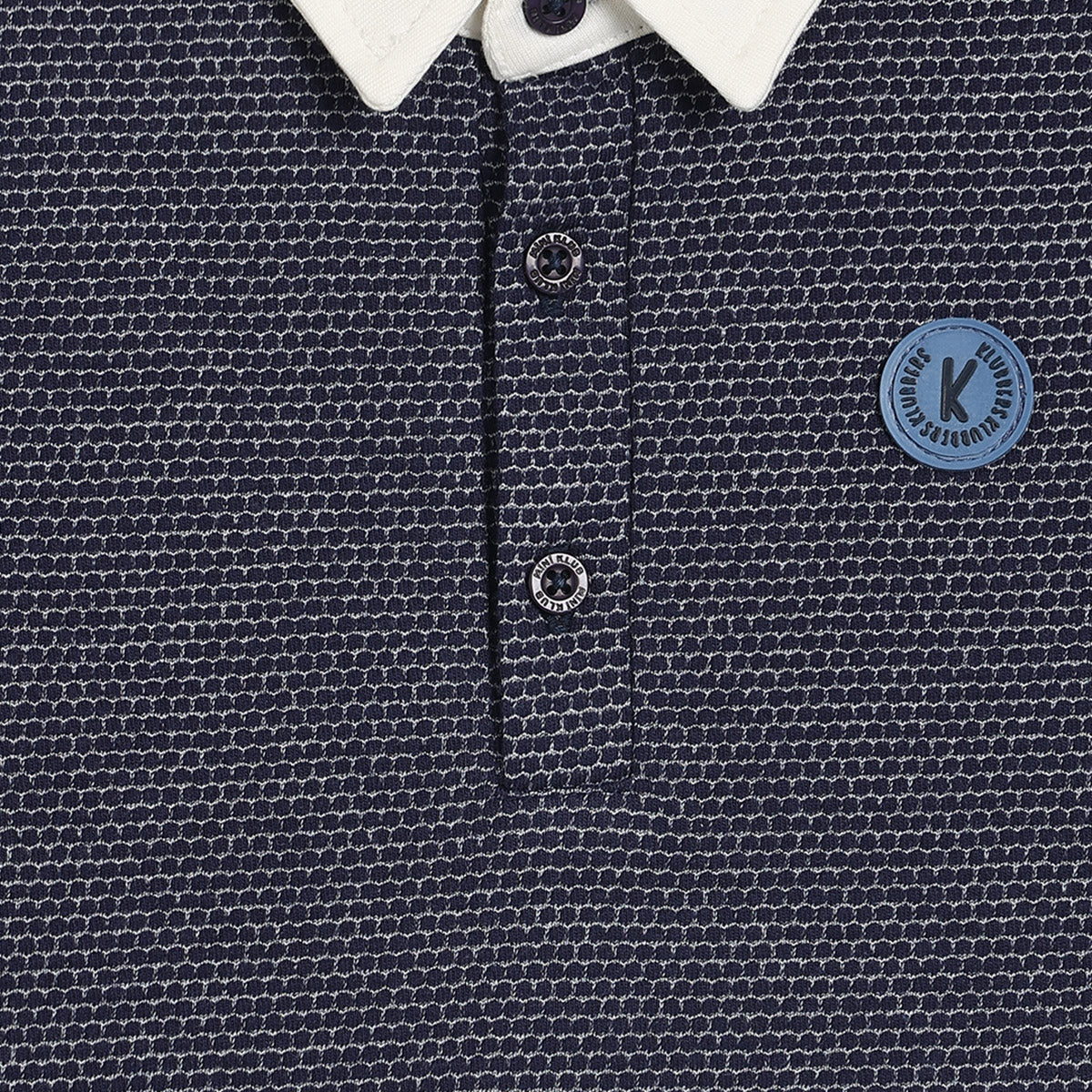 Give your little boy a smart and stylish look with this navy blue and white layered polo T-shirt. Designed to resemble a vest-over-shirt style, it features a textured navy front panel paired with soft white sleeves and collar. The collared neckline with button placket adds a classic touch, while the embroidered logo on the chest enhances its refined appeal. Crafted from soft, breathable cotton fabric, this tee offers all-day comfort—perfect for family gatherings, festive occasions, or casual outings.