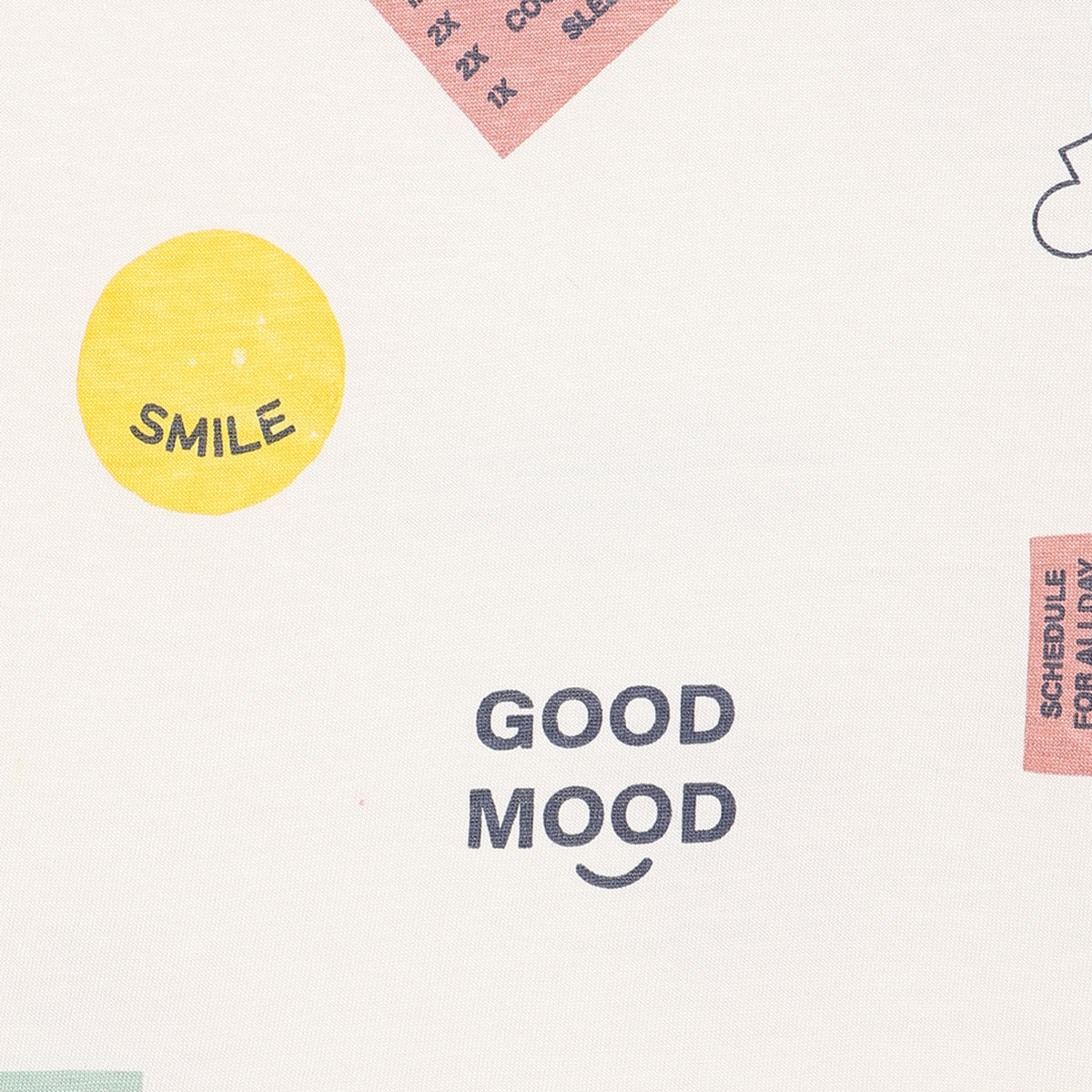 Keep your little one comfy and cheerful with this adorable cream-colored t-shirt featuring fun all-over prints and uplifting text like “Good Mood,” “Smile,” and “Today is the Day.” Made from 100% soft and breathable cotton, this t-shirt feels gentle on delicate skin and is perfect for everyday wear. The round neckline and relaxed fit make it easy to wear and move in, while the playful colors bring a happy vibe to your baby’s outfit.