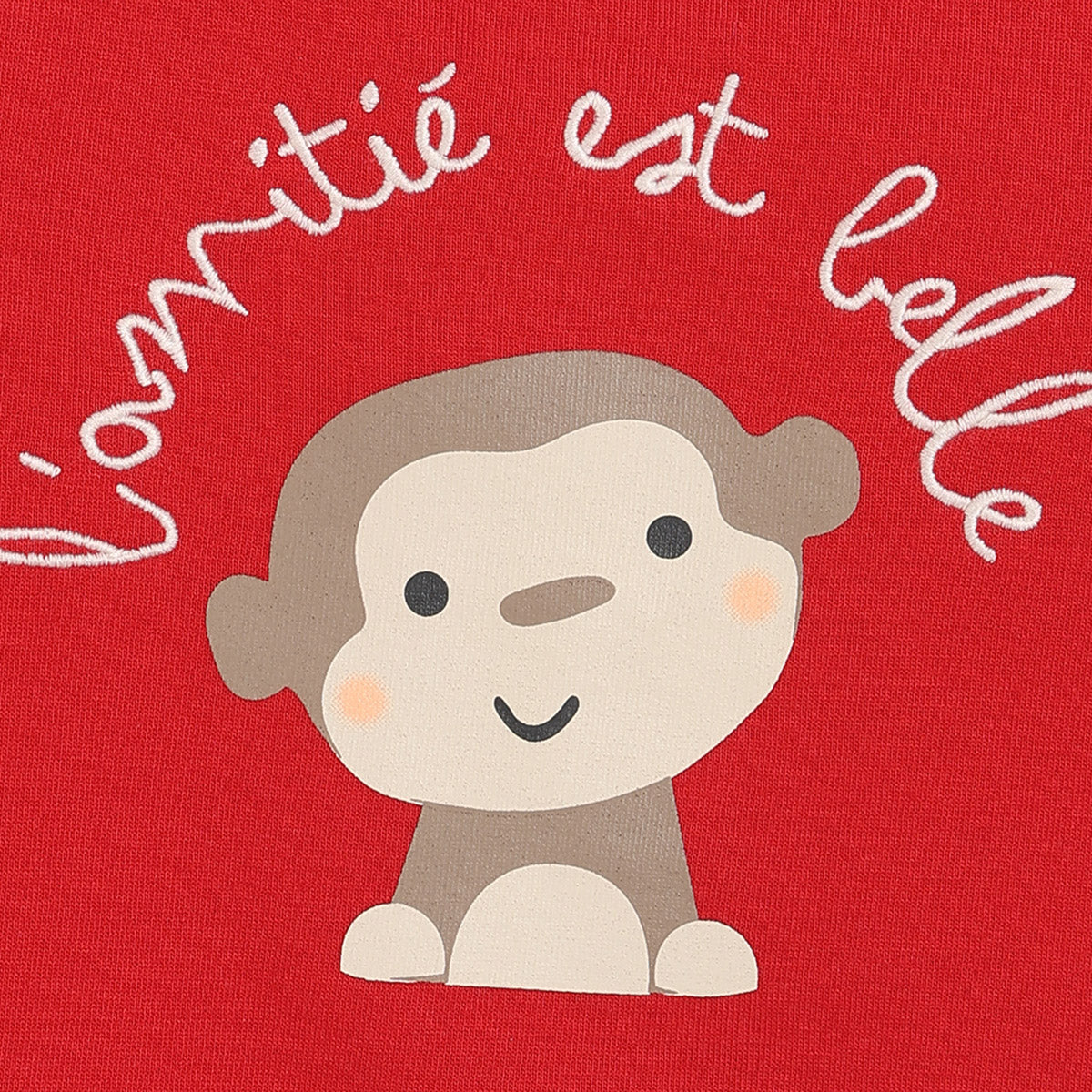 Brighten up your baby’s wardrobe with this adorable red sweatshirt featuring a cute monkey graphic and the text “L’amitié est belle” (Friendship is beautiful). Crafted from soft, breathable cotton-rich fabric, this sweatshirt ensures your little one stays cozy and comfortable all day long. The shoulder snap buttons make dressing and undressing easy, while the ribbed cuffs, neckline, and hem provide a snug fit. Perfect for everyday wear, this cheerful sweatshirt brings warmth and smiles wherever your baby goes.