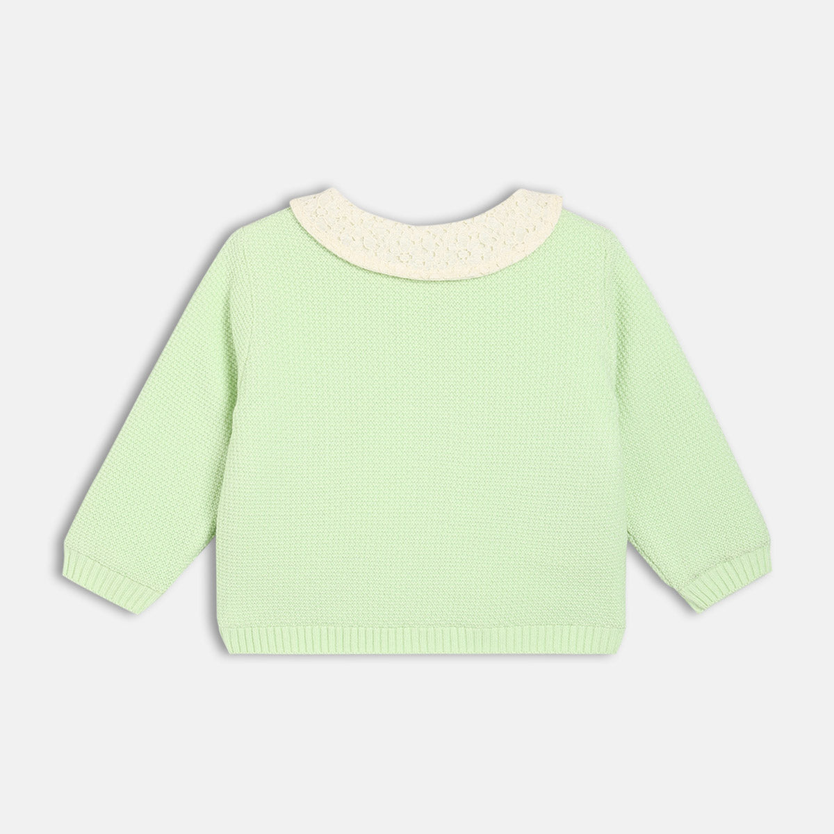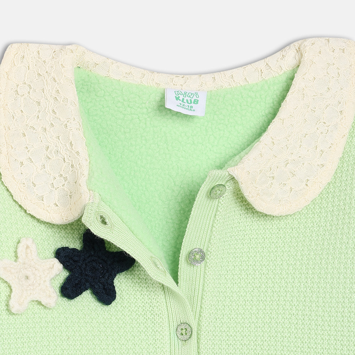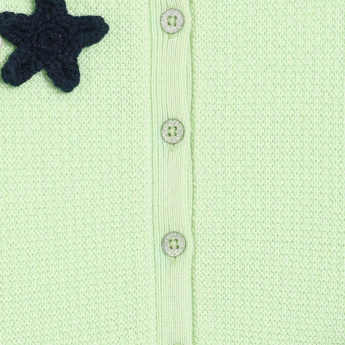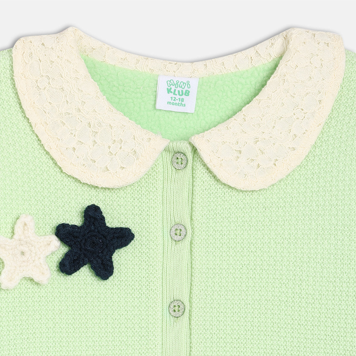 Wrap your little one in cozy cuteness with this pastel green knitted sweater. Designed with a delicate crochet Peter Pan collar and adorable 3D star appliqués, it brings a playful yet classic touch to any outfit. The soft knit fabric provides warmth and comfort, while the front button closure ensures easy wear. Perfect for layering over dresses or tops during cooler days.