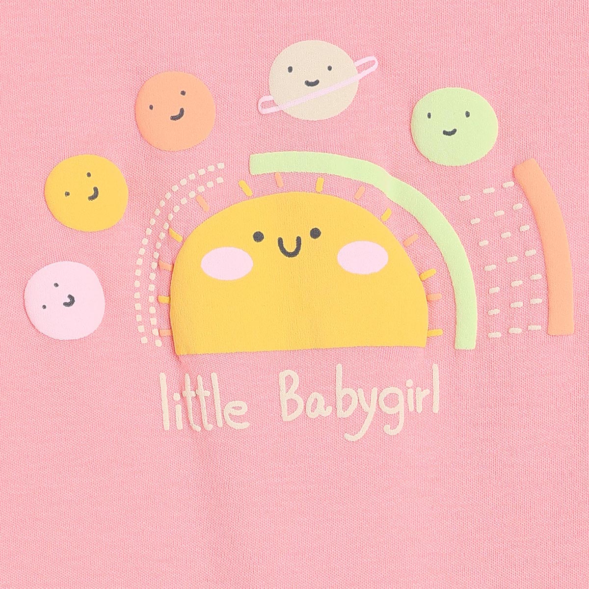 This adorable pack of two baby girl rompers is designed to keep your little one cozy, comfy, and irresistibly cute. It features one cream romper with a cheerful multicolored cloud and sun print, and one pink romper with a sweet “Little Baby girl” rainbow graphic. Crafted from 100% soft and breathable cotton, these rompers ensure gentle care for your baby’s delicate skin. The front snap-button closure allows easy dressing and diaper changes, while the half-sleeve design keeps your baby comfortable all day long. Perfect for daily wear, naptime, or playdates, this set blends practicality with adorable charm.
